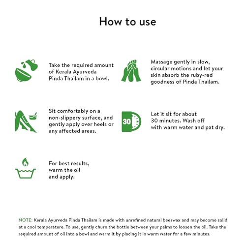 • Easy to use- Kerala Ayurveda Pinda Thailam can be applied on the affected area and gently massaged half an hour before bath. You can warm the oil for better results. Just take some oil in a bowl and place it in warm water. If you are using the oil for the