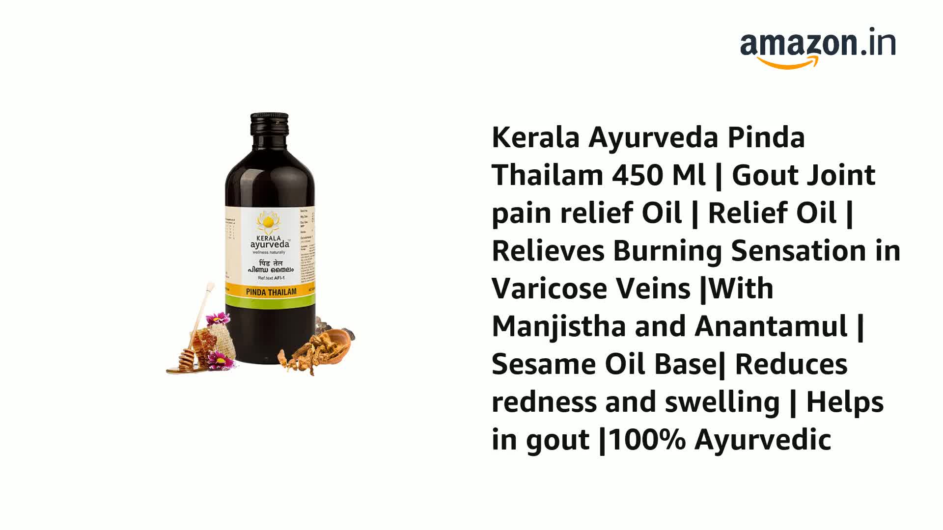 • Quantity: 450 ml; Item Form: Thailam; Relief from burning sensation in Gout- Made with unrefined natural beeswax Kerala Ayurveda Pinda thailam is one of the popular cooling joint pain relief supplements. It helps reduce burning sensation and pain associat