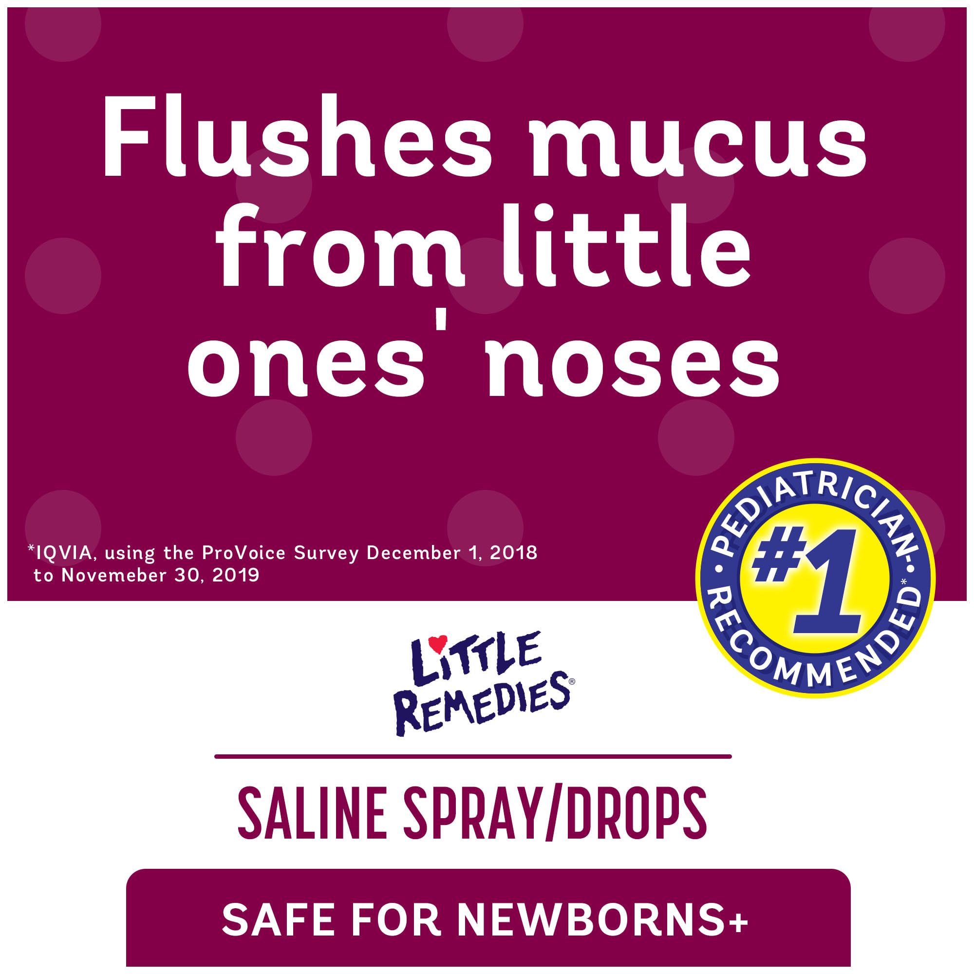 When stuffy noses cause breathing discomfort for your baby Little Remedies Saline Spray and Drops provide safe relief. This product helps loosen mucus secretions to aid removal from the nose and help little ones breathe easy. It is non-medicated and can be used as often as needed without the worry of any harmful side effects or drug interactions. As a parent itthe little things that matter. Your babylittle giggles little steps and little sniffles. Being there with a little hug and a little song. Loving touches and attention to detail go into everything you do. Little things matter to us too. Little Remedies designs safe and reliable solutions just for babies. We pay attention to little details like ensuring our products are free from parabens artificial flavors and dyes. To help your baby stay happy and healthy we make sure they have everything they need. And nothing they don't.