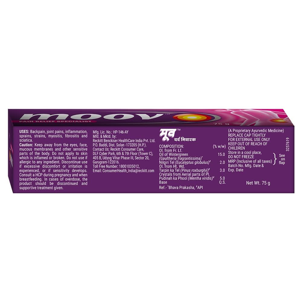 Modern lifestyles can cause both men and women to suffer from innumerable pains for several reasons on various body parts. Pain always comes in uninvited and can occur even while doing everyday tasks such as lifting heavy objects or wrong posture at work or home. But you need not worry if you have MOOV?s trusted pain relief formula by your side. MOOV Pain Relief Cream is one of India's most popular ointments for fast pain relief amongst the homemakers. It is an analgesic (or pain relieving) ointment made using 100% ayurvedic ingredients. Also available in a Spray format that allows easy application. This analgesic (or pain relieving) cream is a First Aid Kit must have with a special formula fortified with the power of "Four Active Ingredients". These penetrate deep inside to produce warmth that relaxes the muscles and help you recover fast. It is pain relieving cream with herbal ingredients such as wintergreen oil mint extract (pudine ke phool) and turpentine oil (tarpin ka tel). These oils are known for their pain relieving properties. Moov provides you fast and long lasting relief from muscle pain neck and backache inflammation sprain myositis fibrositis and sciatica. It works great for chronic neck aches and lower back pains.