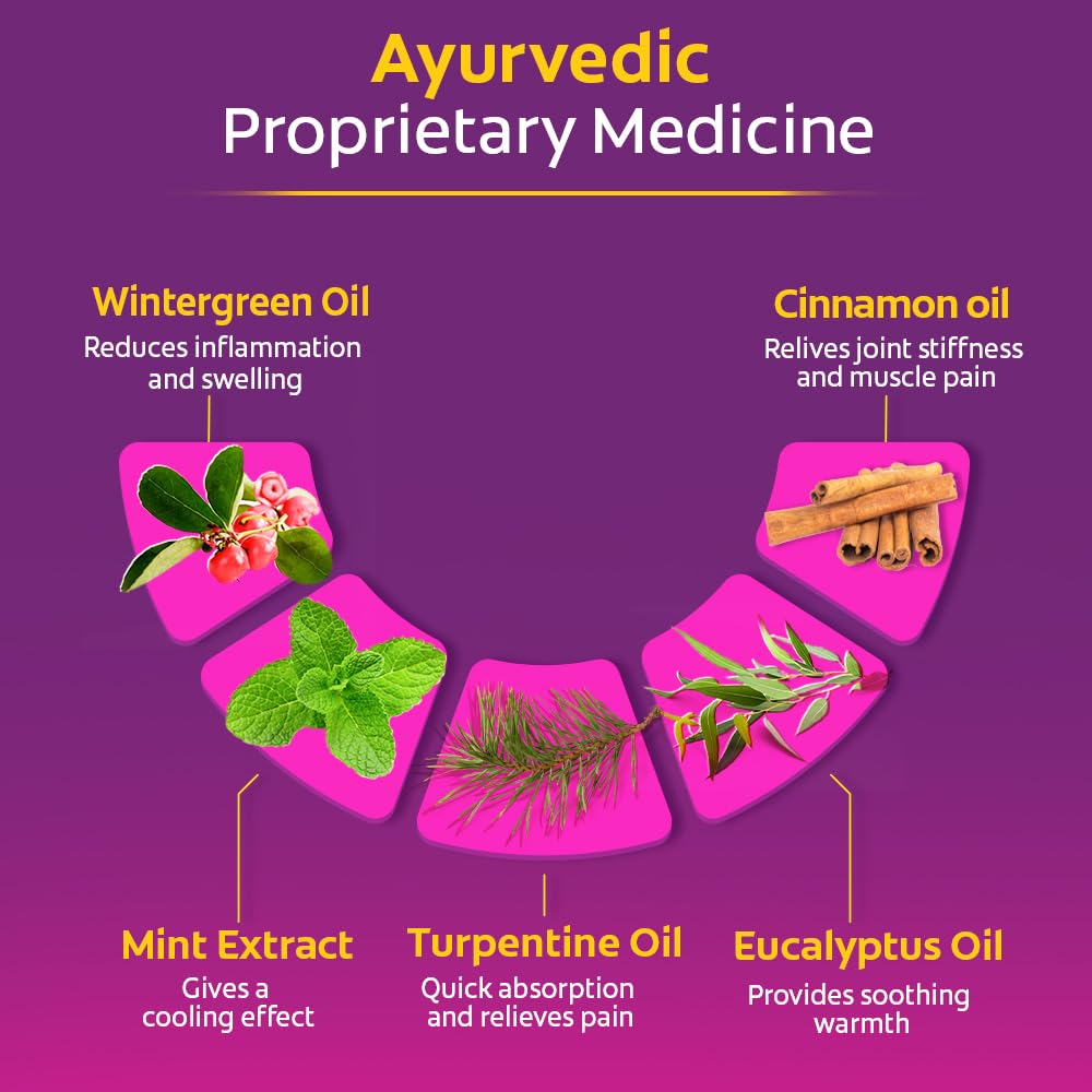 • 100% Ayurvedic formula Contains Eucalyptus Oil Wintergreen Oil Turpentine Oil & Mint Extract