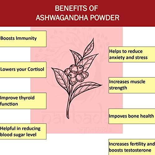 Anxiety and Stress: Narbada Ayurveda Ashwagandha may control stress by reducing the level of Stress hormone. It helps produce calmness increased focus and mental well-being.