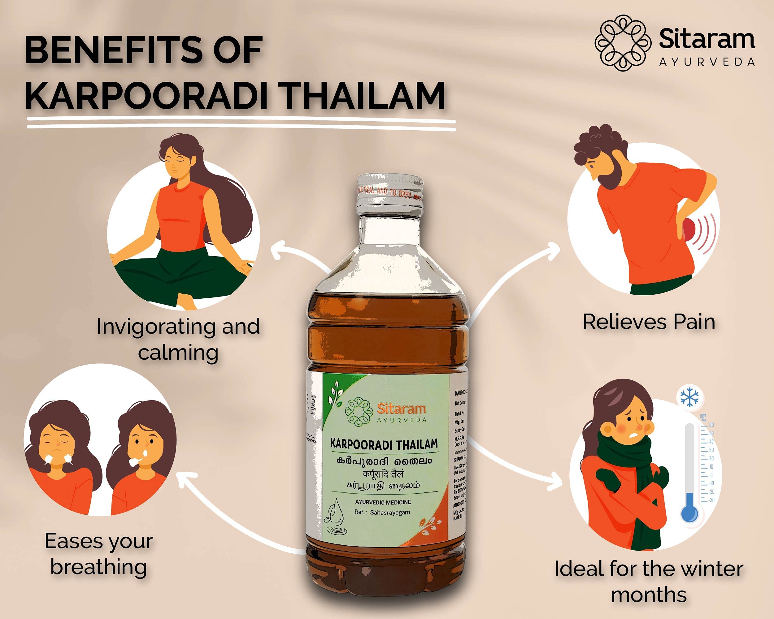 • Karpooradi taila is ideal for the winter months when the Vata element is aggravated in the body and manifests as aches s and rigidity all over the body.
