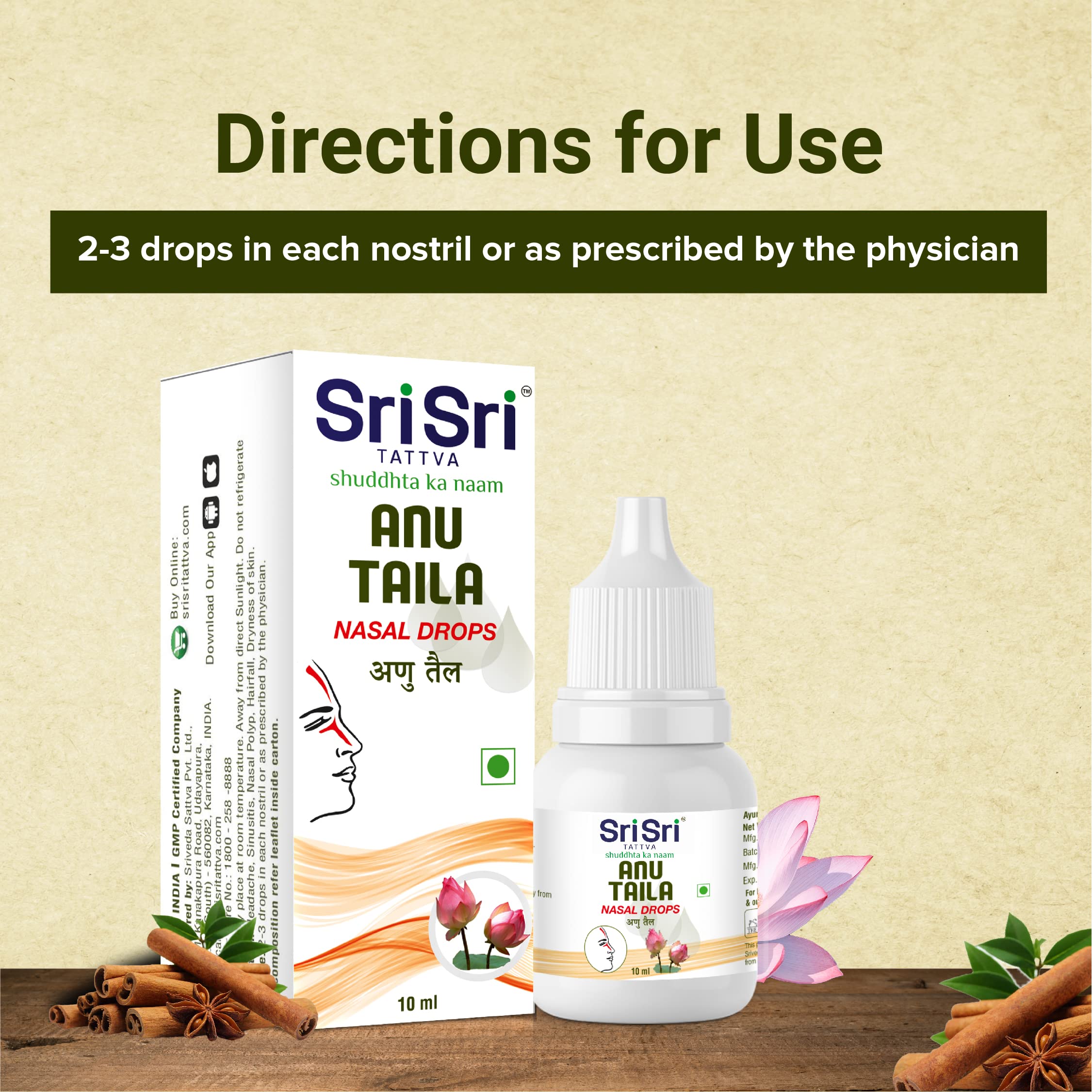 Anu Taila is tridoshashamaka anti-inflammatory and gives strength to the nerves. It is useful in Vata Pitta Khapha imbalances as it balances the tridosha. It is an effective formulation which nourishes and strengthens all the five sense organs - ears eyes nose tongue and throat. It is used in the treatment of headache hair fall premature graying of hair migraines and diseases related to the five sense organs. It is also helpful in balancing the hormone producing glands in the head and neck area.