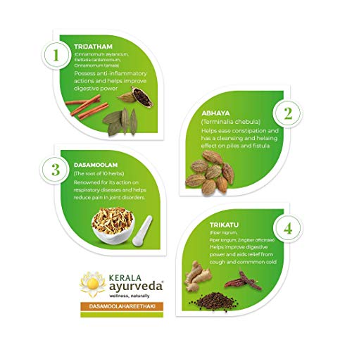 A formulation in Lehyam form Dasamoolahareethaki is beneficial in chronic inflamtory conditions associated with swelling. The intake of this mediciine aids releff from fever rheumatoid arthritis bleeding disorders urinary infection anemia and livr disorders. The nourishing ingredients in Dasamoolahareethaki helps gain body weightt and hence beneficial in emaciation. It also supports healthy bowel movements and helps promote appetite.