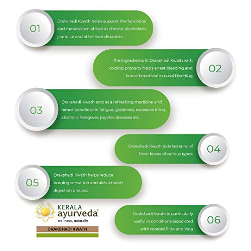 Kerala Ayurveda Drakshadi Kwath is a famous Ayurveda formulation that acts as a cooling and refreshing mediciine by virtue of its ingredients. A good hepato-protective Drakshadi Kwath helps relieve Jaundice bleeding disorders chronic fever and excessive thirst. Drakshadi Kwath helps protect the livr from the ill effects of alcohol and aids smooth metabolism. It also supports deigestive health and helps the burning sensation.