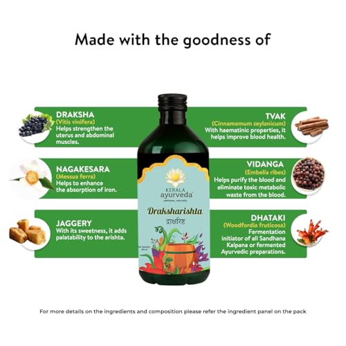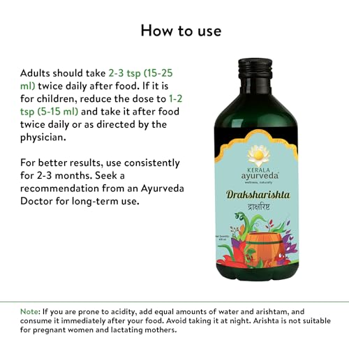 Kerala Ayurveda Draksharishta 450 ml | For Anemia | Non-Constipating Iron Tonic | Herbal Blood Purifier | To Flush Out Blood Impurities | For General Debility | No Artificial Flavors | With, Draksha, Tvak, Ela, Nagakesar, Vidanga, Dhataki, and Jaggery |