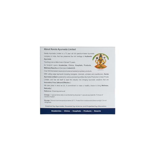Ingredients: each gandha thailam capsule is prepared out of: thila (sesamum indicum sd.) 0.2 G jalam (water)q.S ksheera (milk)1.7 Ml yashtimadhu (glycyrrhiza glabra rt.) 0.25 G manjishta (rubia cordifolia rt.) 5.55 Mg kola (cyperus malaccensis rt.) 5.55 Mg rakthachandana (pterocarpus santalinus rt.) 5.55 Mg sveta sariva (hemidesmus indicus rt.) 5.55 Mg sarjarasa (vateria indica resin/exd.) 5.55 Mg ajmoda (trachyspermum ammi fr.) 5.55 Mg kushta (saussurea lappa rt.)5.55 Mg devadaru (cedrus deodara ht. Wd.) 5.55 Mg yashtimadhu (glycyrrhiza glabra rt.) 5.55 Mg ksheera (milk)0.80 Ml ela (elettaria cardamomum fr.) 0.5 Mg prasniparni (pseudarthria viscida rt.) 0.5 Mg patra (cinnamomum tamala lf.) 0.5 Mg jivanti (holostemma adakodien rt.) 0.5 Mg tagara (valeriana wallichi rt.) 0.5 Mg lodhra (symplocos racemosa st. Bk) 0.5 Mg durva (cassia tora rt.) 0.5 Mg guduchi (tinospora cordifolia st.) 0.5 Mg ksirakakoli (lilium polyphyllum rt. Tr.) 0.5 Mg kakoli (lilium polyphyllum rt. Tr.) 0.5 Mg meda (polygonatum cirrhifolium rt.) 0.5 Mg mahameda (polygonatum cirrhifolium rt.) 0.5 Mg ridhi (habenaria intermedia rt. Tr.) 0.5 Mg vridhi (habenaria intermedia rt. Tr.) 0.5 Mg sveta sariva (hemidesmus indicus rt.) 0.5 Mg sringataka (pistacia integerrima rt.) 0.5 Mg madhuyashti (glycyrrhiza glabra rt.)0.5 Mg manjishta (rubia cordifolia rt.)0.5 Mg kushta (saussurea lappa rt.) 0.5 Mg sarjarasa (shorea robusta resin/exd.) 0.5 Mg jatamansi (nardostachys jatamansi rt.)0.5 Mg devadaru (cedrus deodara ht. Wd.)0.5 Mg rakthachandana (pterocarpus santalinus ht. Wd.)0.5 Mg ajmoda (trachyspermum ammi sd.)0.5 Mg hrivera (coleus vettiveroides rt.) 0.5 Mg.