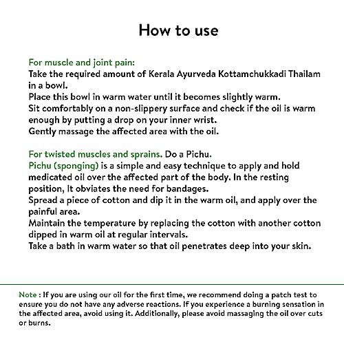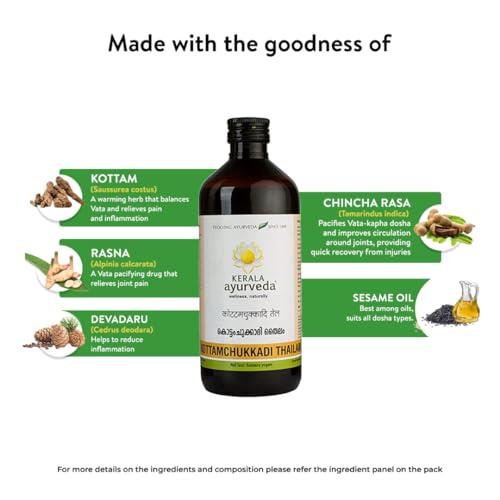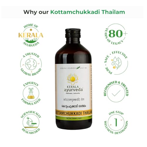 Kottamchukkadi thailam is renowned for its therapeutical benefits on Vata disorders. Highly acclaimed for its painn relieving action Kottamchukkadi thailam helps subside in joint disorders. It is beneficial in Sciatica Spondylosis Arthritis Myalgia and Tennis elbow. Kottamchukkadi Thailam helps numbness and stiffness in Vata predominant conditions.