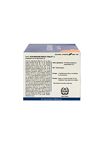 Sukumaram Kwath Tablet is the modified dosage form of the classical mediciine Sukumaram Kashayam. It is very effective in deigestive system disorders and helps relieve constipation and abdominal painn associated with various conditions. Sukumaram Kwath Tablet helps correct menstrual irregularities in women and diseses arising out of hormonal imbalances like PCOS. The combination of ingredients in Sukumaram Kwath Tablet makes it beneficial in rheumatic complaints and different types of swelling.