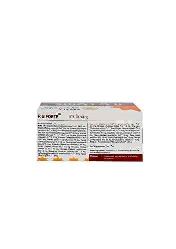 Ingredients: Each rg forte Tab.. contains: extracts of guggulu (balsamodendron mukul) 14. 28 Mg eranda (ricinus communis) 10. 6 Mg satavari (asparagus racemosus) 10. 6 Mg kokilaksa (asteracantha longifolia. 10. 6 Mg nirgundi (vitex negundo) 10. 6 Mg amalaki (emblica officinalis) 10. 07 Mg haritaki (terminalia chebula) 10. 07 Mg bibhitaka (terminalia belerica). 10. 07 Mg shallaki (boswellia serrata) 10 mg yavani (trachyspermum ammi) 1. 9 Mg yavakshara (carbonate of potash) 1. 9 Mg sugandha (alpinia officinarum) 1. 9 Mg sunthi (zingiber officinale) 1. 9 Mg devadaru (cedrus deodara) 1. 9 Mg suksmaila (elettaria cardmomum). 1. 9 Mg svetajirika (cuminum cyminum 1. 9 Mg vanyajiraka (centratherum anthelminticum) 1. 9 Mg pippali (piper longum) 1. 9 Mg upakuncika (nigella sativa) 1. 9 Mg maricha (piper nigrum) 3. 8 Mg chitraka (plumbogo indica) 1. 9 Mg dhanyaka (coriandrum sativum) 1. 9 Mg kushta (saussurea lappa) 1. 9 Mg musta (cyperus rotundus) 1. 9 Mg gokshura (tribulus terrestris) 1. 9 Mg tvak patra (cinnamomum tamala) 1. 9 Mg ushira (vettivera zizanioides) 1. 9 Mg talisa (abbies webbiana) 1. 9 Mg pippali (piper longum) 1. 9 Mg vidanga (embelia ribes) 1. 9 Mg sariaka (vateria indica) 40 mg powders of pravalabhasmam 50 mg saindhava 8. 9 Mg.