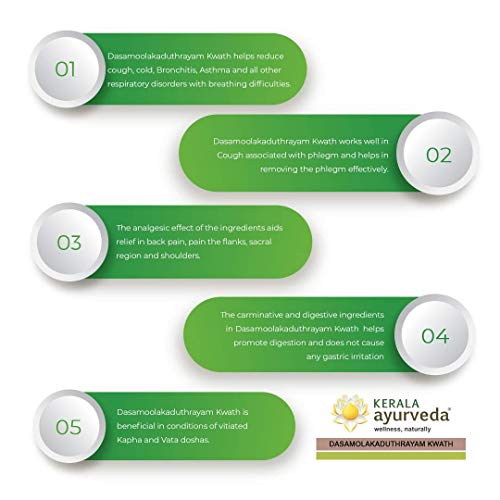 Dasamoolakaduthrayam Kwath is a classical formulation that acts as an effective bronchodilator. Beneficial in respiratory disorders Dasamoolakaduthrayam Kwath also helps reduce pain in the flanks sacral region and shoulders and also beneficial in all types of back pain. It eases the digestion process and also helps relieve flatulence.