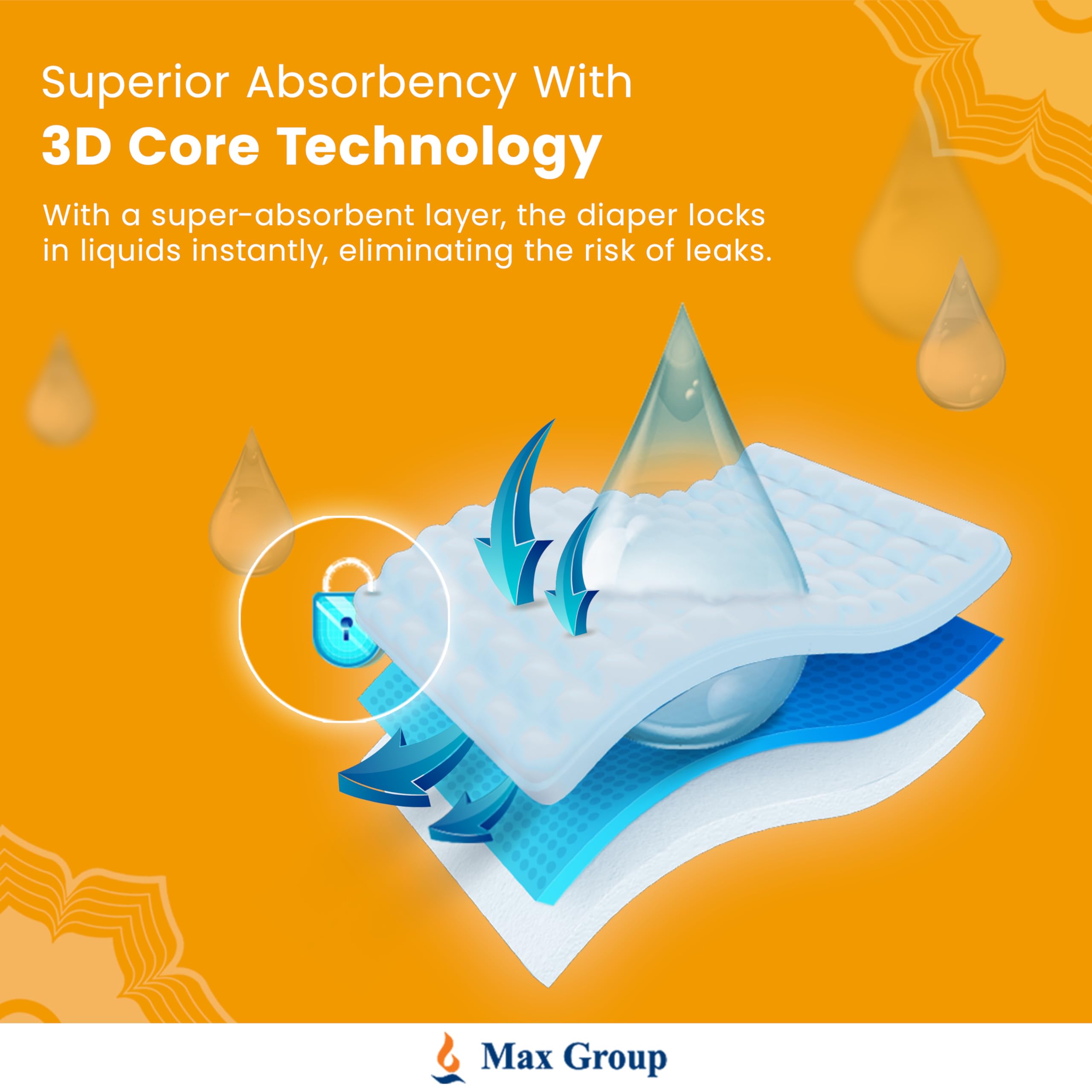 Stay Dry and Confident Ultimate Leak Protection with our 3D Core Technology with a super absorbent layer instantly locks in liquids keeping you worry free.