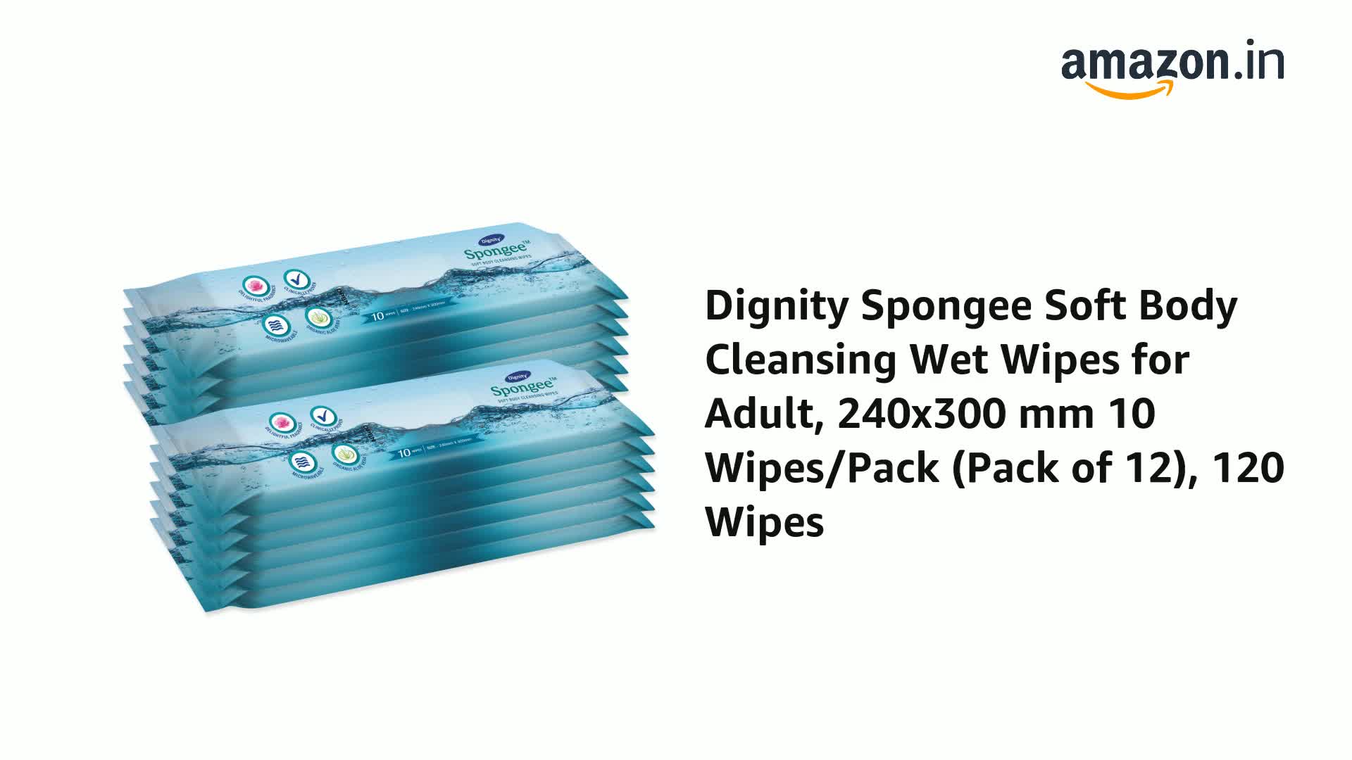 Dignity Spongee Soft Body Cleansing Wet Wipes for Adult, 240x300 mm, 10 Wipes/Pack (Pack of 12), 120 Wipes