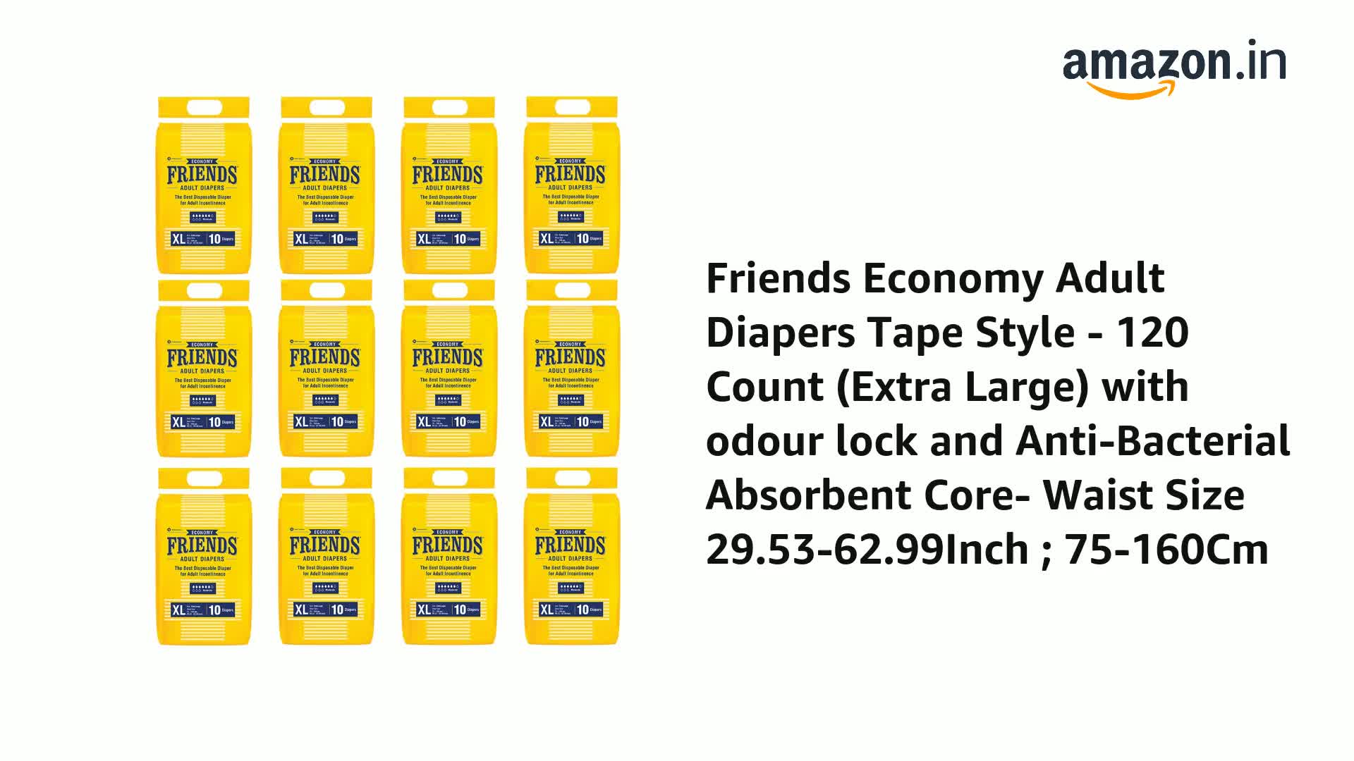 Friends Economy Adult Diapers Tape Style - 120 Count (Extra Large) with odour lock, Unisex, Leakproof, Wetness Indicator and Anti-Bacterial Absorbent Core - Waist Size 32.68-59.84 inch; 83-152 cm