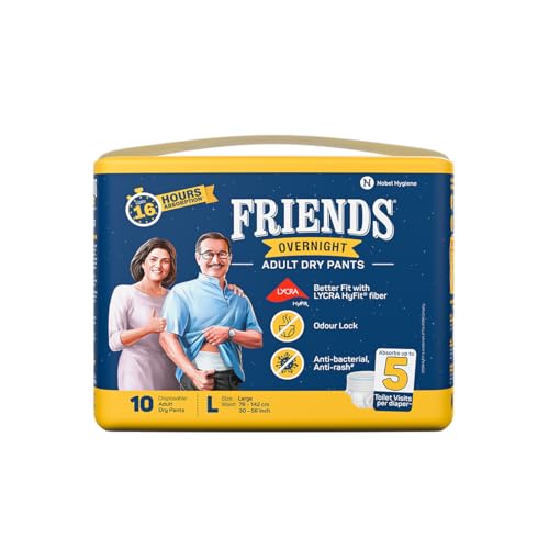 Friends Overnight Adult Diapers Pants Style - 10 Count (Large) with odour lock, Unisex, Leakproof, Elastic Waist and Anti-Bacterial Absorbent Core - Waist Size 30-56 Inch; 76-142 cm