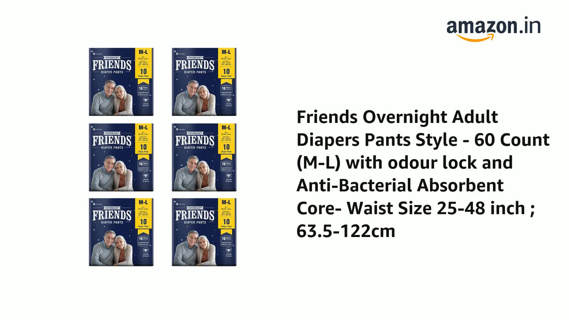 Friends Overnight Adult Diapers Pants Style - 60 Count (Medium) with odour lock, Unisex, Leakproof, Elastic Waist and Anti-Bacterial Absorbent Core - Waist Size 25-48 inch; 63.5-122 cm