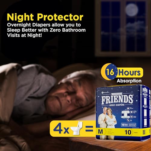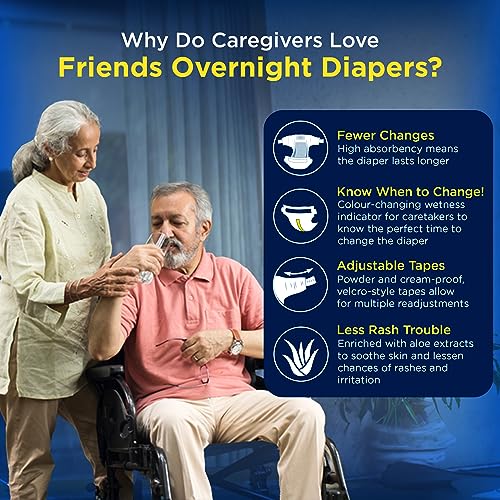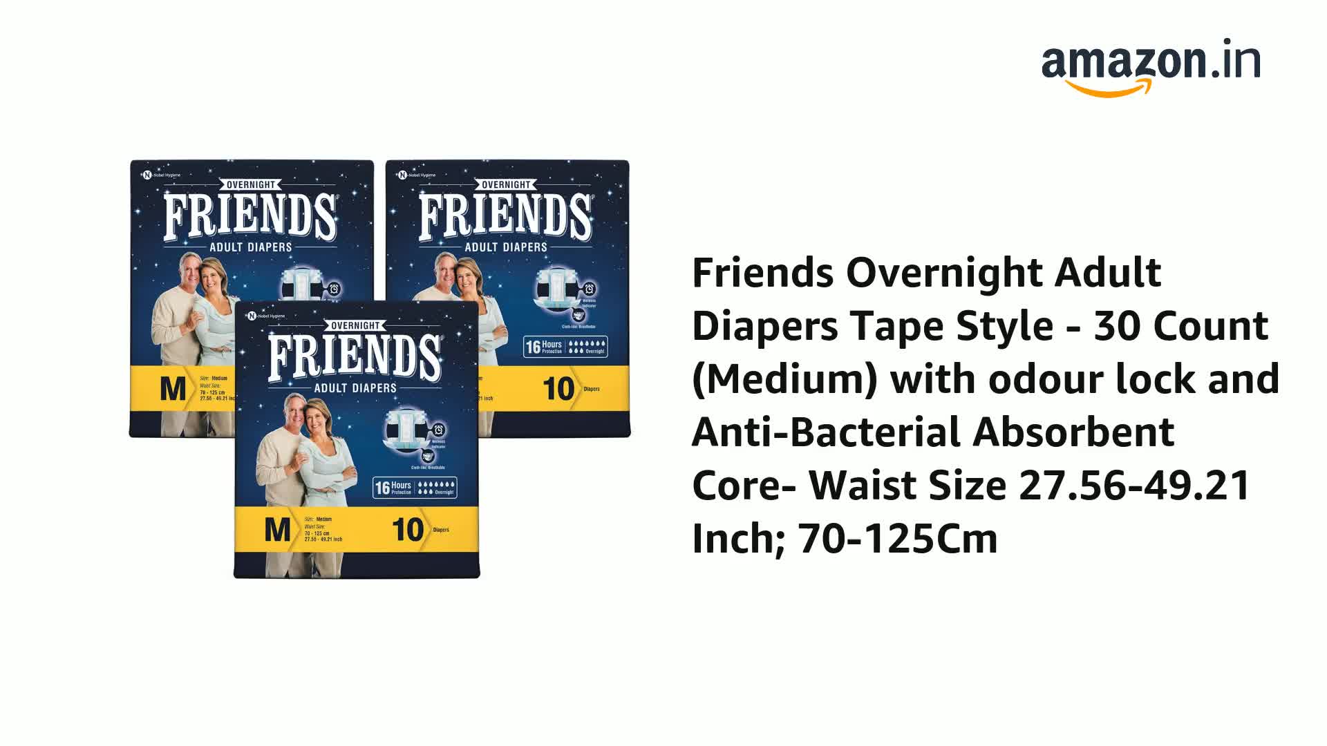 • Friends Adult Diapers medium size tape style with 16+ hours of absorption are also available in sizes L and XL.