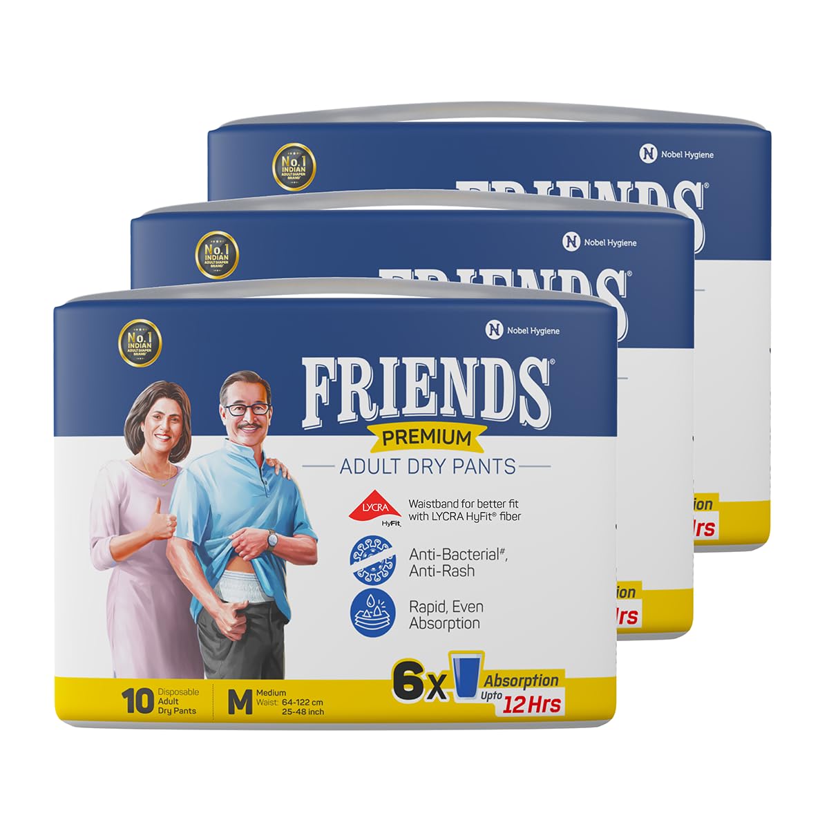 Friends Premium Adult Diapers Pants Style - 30 Count (Medium) with odour lock, Unisex, Leakproof, Elastic Waist and Anti-Bacterial Absorbent Core - Waist Size 25-48 inch; 63.5-122 cm