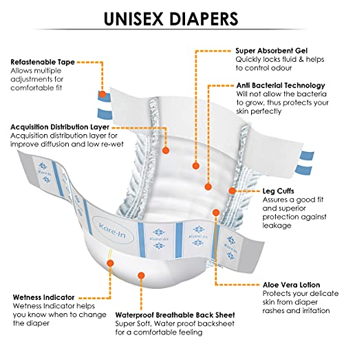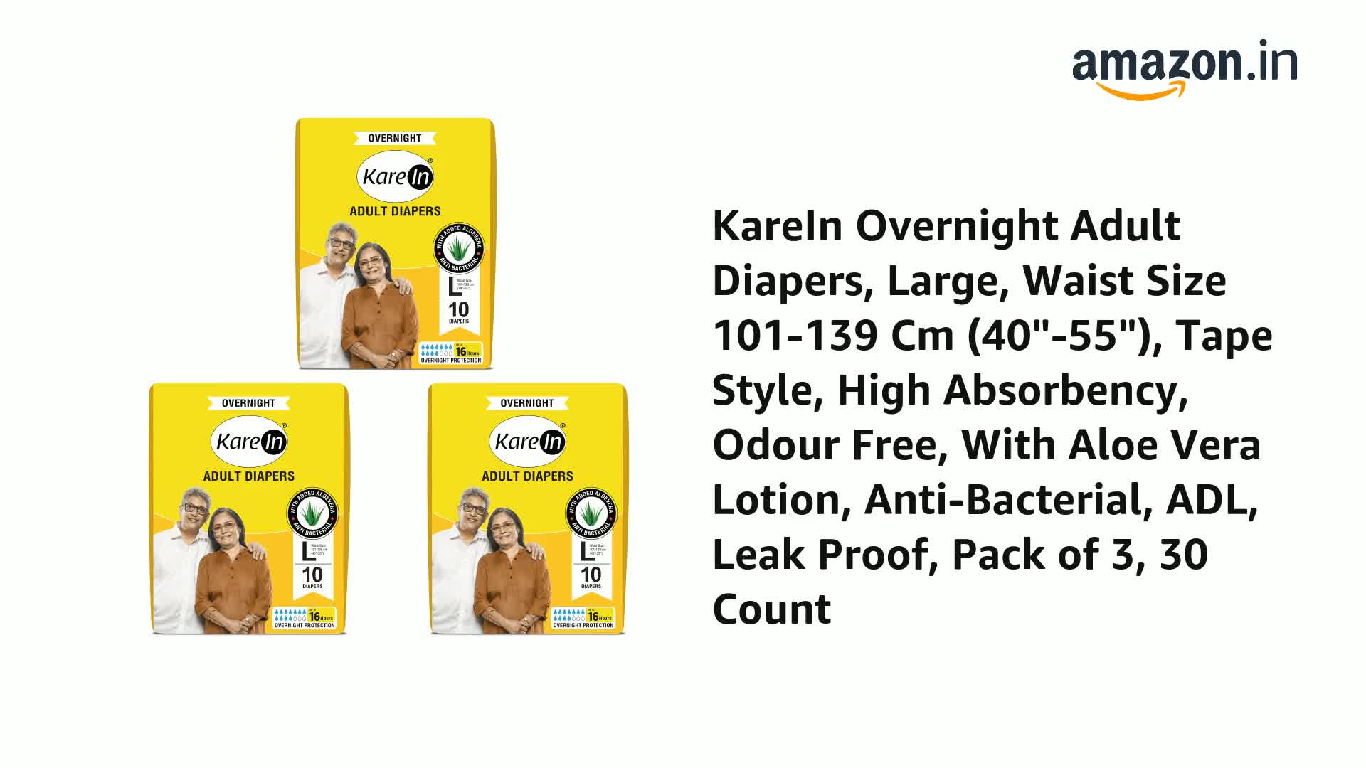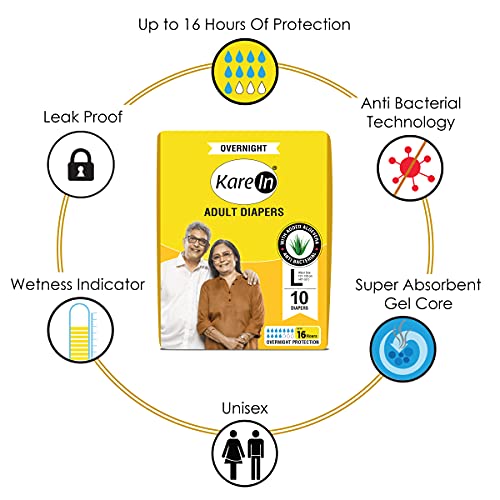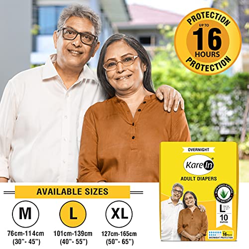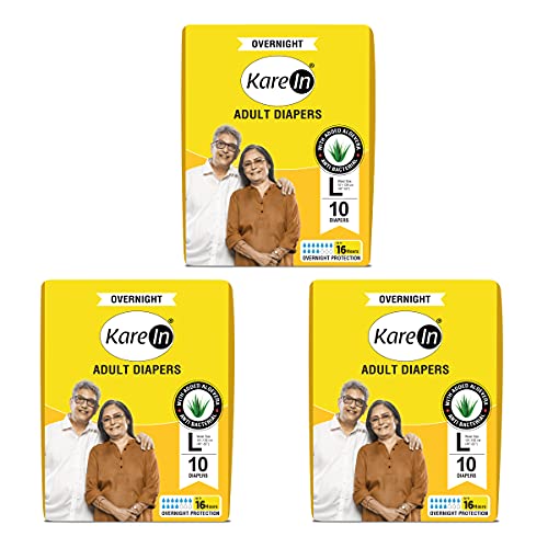 KareIn Overnight Adult Diapers Large Waist Size 101-139 Cm (40"-55") Tape Style High Absorbency Odour Free With Aloe Vera Lotion Anti-Bacterial ADL Leak Proof Pack of 3 30 Count