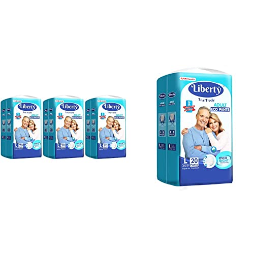 Liberty Eco Adult Diaper Pants Unisex Large 3x20 Pcs Waist Size (75-140 cm | 30-55 Inches) (Pack of 3)Adult Incontinence should just be a Worry free impediment in your advancing years. We introduce to you Liberty Adult Pants to help you enjoy the golden Years Worry free. Made with extra soft materials. Underwear like shape with additional supporting elastics. It give your freedam of mobility with the extra absorbrnt slim core stabilized with fluid distribution channels.Liberty Eco Adult diaper pants Large 20 pcs (75-140 Cms || 30-55 inches)Adult Eco Pants | Overnight Protection Adult Incontinence should just be a worry-free impediment in your advancing years. We introduce to you Liberty Adult Eco Pants to help you enjoy the Golden Years worry-free. Made with extra oft materials it gives your freedom of mobility with the extra absorbent slim core stabilized with fluid distribution channels.