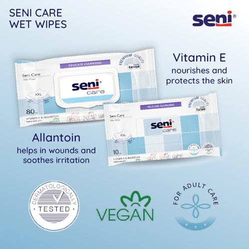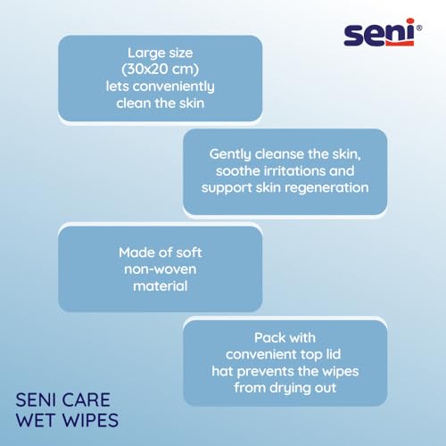 Seni care special wet wipes made for effective skin cleansing without the usage of water. Ideal for bedridden persons with incontinence perfect to wipe the skin when changing a diaper. A must-have for daily hygiene of bedridden patients. One wipe is enough to clean and moisturize the body. Convenient also during travelling; Contain vitamin e and allantoin â active ingredients that soften epidermis smooth crack and calluses accelerate woundsâ healing; Gently cleanse moisturize the skin; Refresh and remove unpleasant smell.