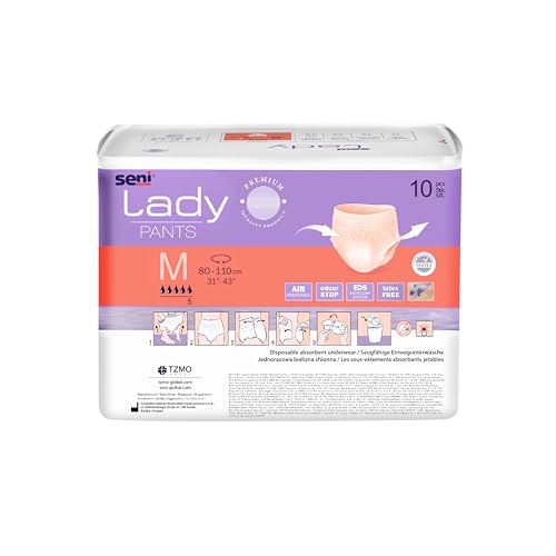Seni Lady Bladder Control Pants for Women | Light Incontinence | Breathable | Extra Dry System | latex free | Disposable Absorbent Underwear | Odour Stop | Dermatologically Tested | Size Medium | Waist Size 31" - 43" (80 cm - 110 cm) | Pack of 1 | 10 Pcs