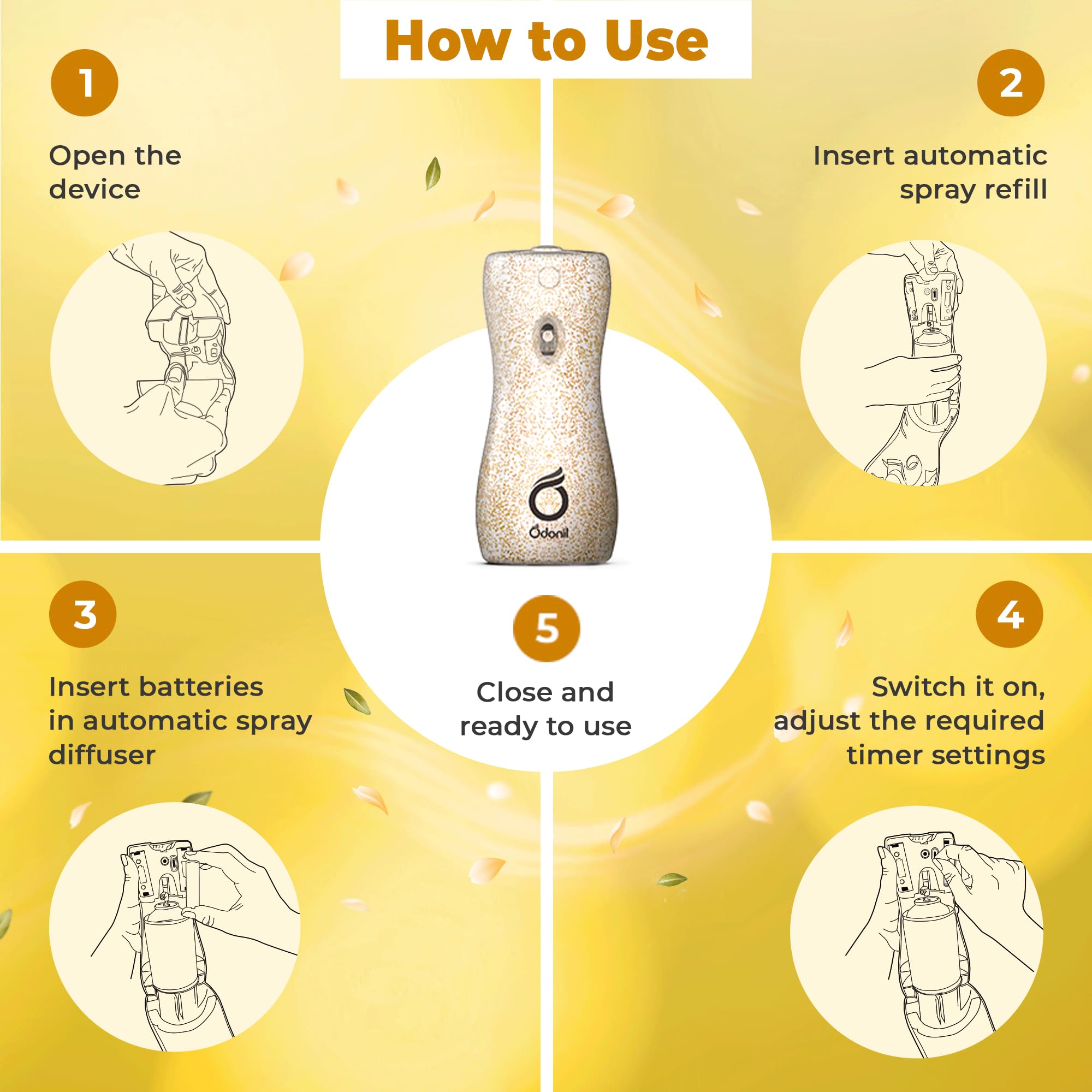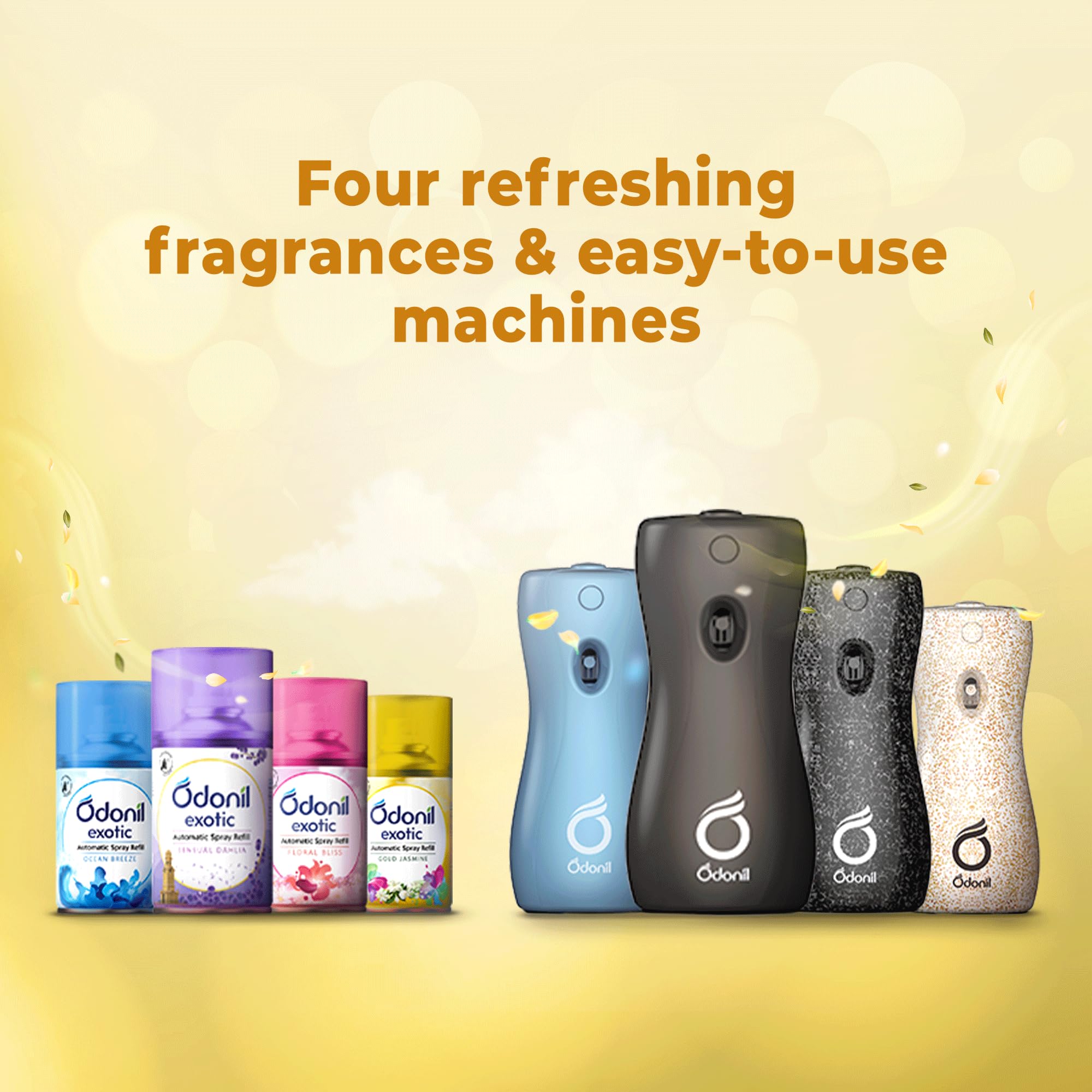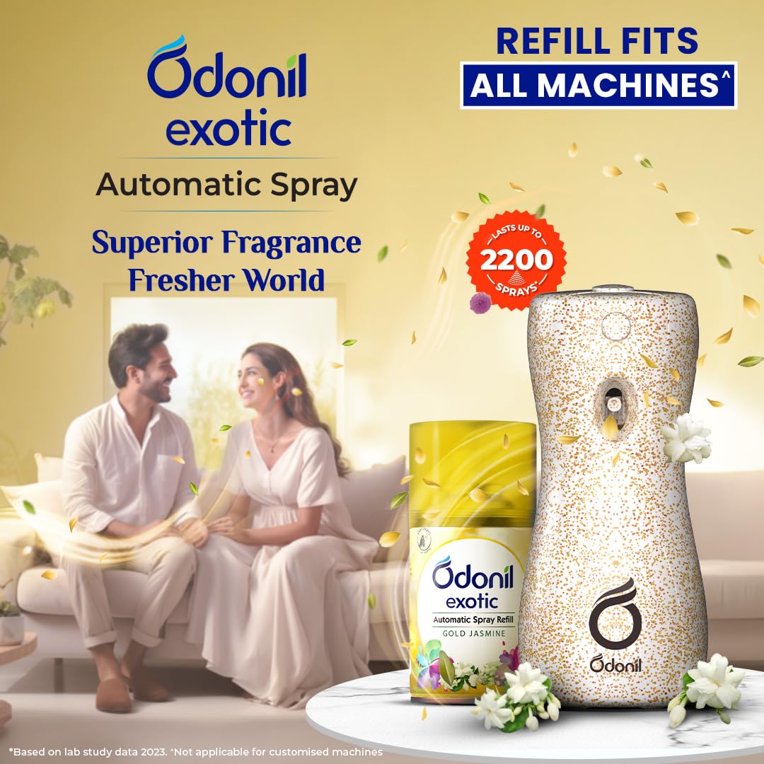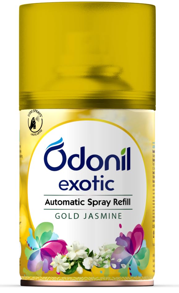 Indulge your senses with Odonil Exotic Automatic Spray featuring alluring essence of Gold Jasmine. It gives you 2x long lasting fragrance and lasts upto 2200 sprays with additional germ protection features. Experience Gold Jasmine an opulent fragrance made with silky jasmine and fresh mandarin notes that will take you on a musky ambery trail!