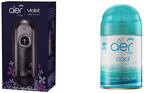 Godrej aer Matic Kit - Automatic Air Freshener with Flexi Control | Violet Valley Bloom (225ml)Godrej aer matic is a range of automatic air fragrance diffusers available in four designer fragrances. By designer we mean they smell just as great as they look. All this with a flexi-control timer that sprays every 10 20 or 40 minutes allowing you to control fragrance intensity. With it's killer looks our automated air freshner is sure to adorn your interior spaces and works perfectly be it your living room bedroom or office spaces. It can easily be wall mounted with the provided mounting hole at the back or can be placed on a shelf with the inbuilt stand. Our battery operated room freshener keeps your space fragrant 24x7 without any hassle. And whats more each refill pack guarantees 2200 sprays and lasts upto 60 days (under low settings). At the end of its cycle you just need to replace the air freshener refill unit with any of our 4 designer fragrances- Violet Valley Bloom Fresh Lush Green Petal Crush Pink and Cool Surf Blue.Godrej aer Matic Refill - Automatic Air Freshener with Flexi Control | Cool Surf Blue (225ml)Godrej aer matic is a range of automatic air fragrance diffusers available in four designer fragrances. By designer we mean they smell just as great as they look. All this with a flexi-control timer that sprays every 10 20 or 40 minutes allowing you to control fragrance intensity. With it's killer looks our automated air freshner is sure to adorn your interior spaces and works perfectly be it your living room bedroom or office spaces. It can easily be wall mounted with the provided mounting hole at the back or can be placed on a shelf with the inbuilt stand. Our battery operated room freshener keeps your space fragrant 24x7 without any hassle. And whats more each refill pack guarantees 2200 sprays and lasts upto 60 days (under low settings). At the end of its cycle you just need to replace the air freshener refill unit with any of our 4 designer fragrances- Violet Valley Bloom Fresh Lush Green Petal Crush Pink and Cool Surf Blue.