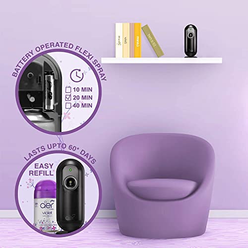 Godrej aer matic is a range of automatic air freshener diffusers available in four fragrances. This air freshener for room with a flexi-control timer sprays every 10 20 or 40 minutes allowing you to control fragrance intensity. The air freshener automatic spray is sure to adorn your interior spaces and works perfectly be it your living room bedroom or office spaces. The automatic room freshener can easily be wall mounted with the provided mounting hole at the back or placed on a shelf with the inbuilt stand. Our battery operated room freshner keeps your space fragrant 24x7 without any hassle. Each refill pack guarantees 2200 sprays and lasts up to 60 days (under low settings). At the end of its cycle just replace the air freshener refill with any of our four fragrances- Violet Valley Bloom Fresh Lush Green Petal Crush Pink and Cool Surf Blue.