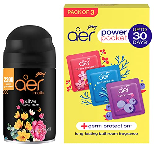 Godrej aer Smart Matic Refill - BLUETOOTH ENABLED Automatic Air Freshener Spray | Alive (225ml) & Power Pocket Air Freshener- Bathroom and Toilet Lasts Up to 30 days - Assorted Pack of 3