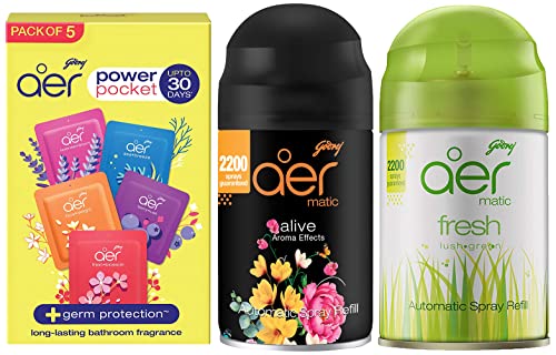 Godrej aer power pocket is a range of toilet fresheners that are available in 5 beautiful fragrances. This bathroom freshener for toilet has a unique power gel technology that keeps the bathroom fragrant for up to 30 days. The toilet freshener for bathroom is odour neutralizer and it ensures a refreshing fragrance every time you step into the bathroom. This toilet freshener is easy to use and can be hung in the bathroom with the hook provided. Godrej aer matic is a range of automatic air freshener diffusers available in four fragrances. This air freshener for room with a flexi-control timer sprays every 10 20 or 40 minutes allowing you to control fragrance intensity. The air freshener automatic spray is sure to adorn your interior spaces and works perfectly be it your living room bedroom or office spaces. The automatic room freshener can easily be wall mounted with the provided mounting hole at the back or placed on a shelf with the inbuilt stand. Our battery operated room freshner keeps your space fragrant 24x7 without any hassle. Each refill pack guarantees 2200 sprays and lasts up to 60 days (under low settings). At the end of its cycle just replace the air freshener refill with any of our four fragrances- Violet Valley Bloom Fresh Lush Green Petal Crush Pink Alive Passion and Cool Surf Blue.
