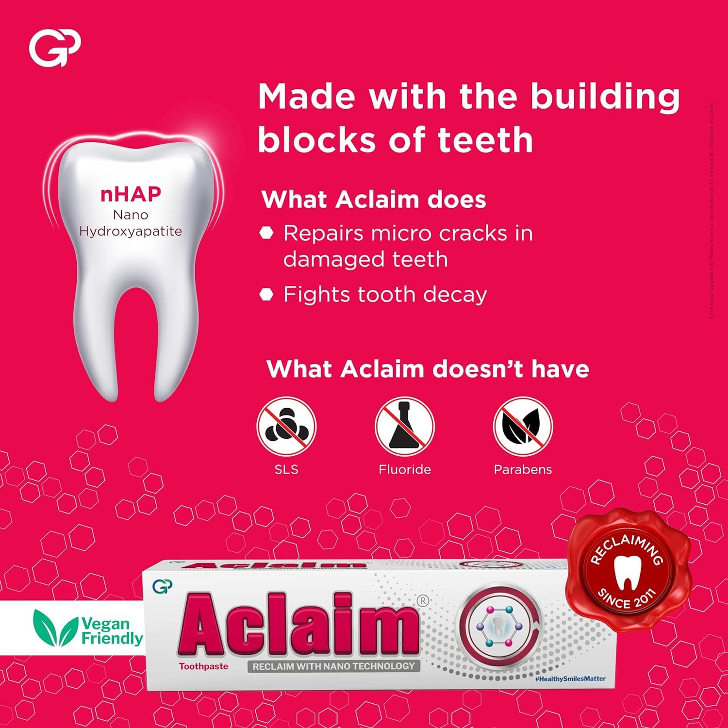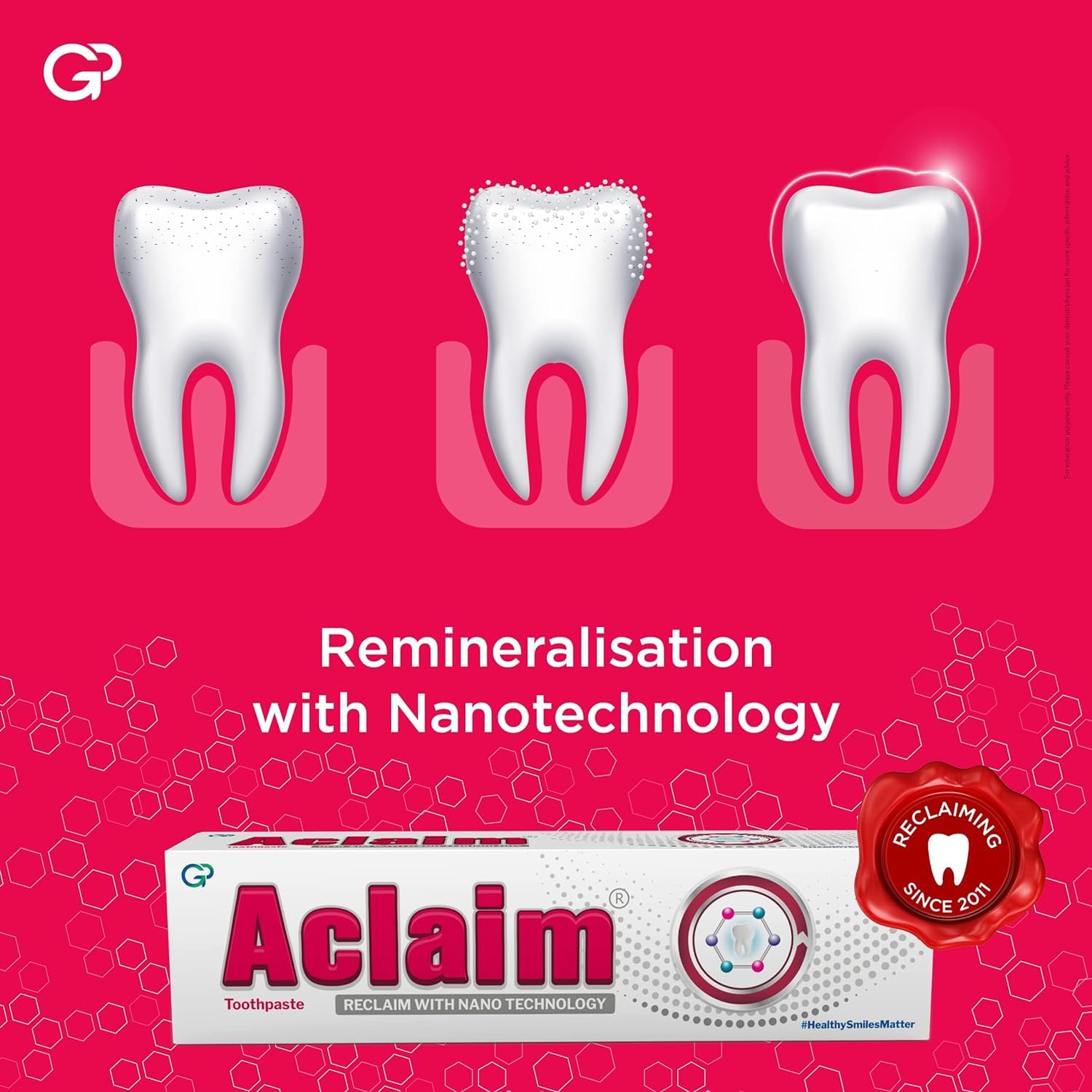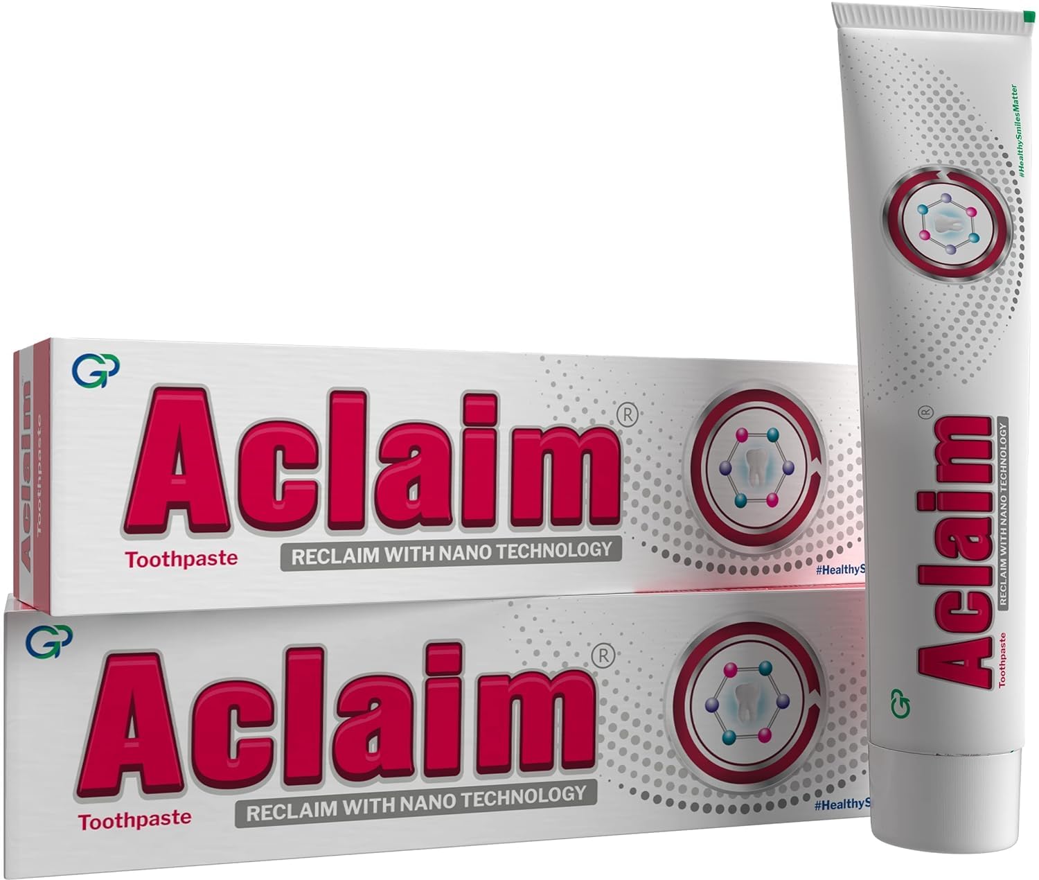 REMINERALISING TOOTHPASTE: Aclaim restores lost minerals in the tooth enamel by entering even the minute cracks by forming a protective wash-resistant layer around the tooth to prevent decay thereby providing complete oral care. Aclaim integrates nano-HAp