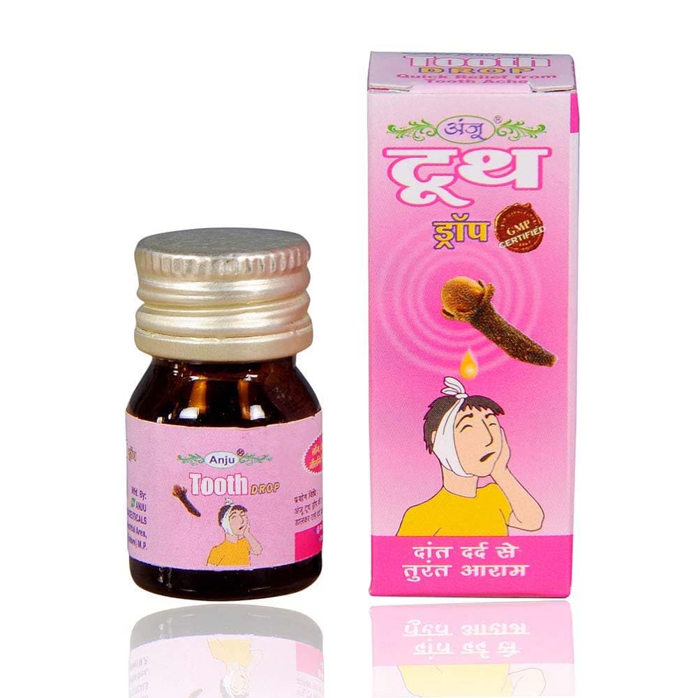Negligence in maintaining good oral habits not cleaning the mouth properly or consuming very hard or hot edible items often affect the teeth which result in acute pain. If the problem is not addressed in time it may result in decay of teeth right from root develops foul smell from mouth and contracts similar disorders to neighbouring teeth. In such condition a soothing but effective cure that can be applied within mouth is needed unlike applications used to relieve muscular pain which contain non-edible ingredients. Hence Anju Tooth Drop proves to be a really useful and effective medicine that doesnât have any side effect. It can be used by a person of any age. Anju Tooth Drop contains extremely beneficial ingredients like: Laung (Clove): Clove oil is known for its antimicrobial antifungal antiseptic and antiviral properties. Its properties as a germicidal agent makes it useful to relieve dental pain bleeding gums and ulcers. Ajwain (Carom Seeds): Helpful in maintaining Oral hygiene. Neelgiri (Eucalyptus): Helps as disinfectant and removes mouth odour. Also it helps in strengthening gums and has microbial properties. Kapoor (Camphor): Helps in reducing inflammation/sensation in tooth. All these items are edible in nature and find their wide application in Indian kitchen. Hence when taken for medicinal use they neither cause any side effect nor disturb the taste but stop the pain immediately and also help in curing the causes of pain. Not only that Anju Tooth Drop provides a freshening feel to mouth and breath. This prevents the foul smell due to decaying tooth. Dose: In conditions relating pain in tooth put 2-3 drops of Anju Tooth Drop on a clean cotton piece and apply it on painful tooth. It provides immediate relief from the pain. In case of acute pain apply Anju Tooth Drop 2 to 3 times.