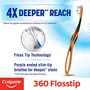 Colgate 360° Floss-Tip Toothbrush comes with a unique floss-tip bristle design for deep cleaning and gentle action. It provides 4x deeper reach to clean mouth thoroughly. The brush is designed to clean parts of the mouth other flat trim brushes can miss. The special purple-ended tapered bristles provide a deep clean action on both sides of the teeth and along the gumline while the cheek & tongue cleaner works to clean more than just teeth. Easy-to-hold brush handle ensure to give comfortable grip during brushing. The toothbrush cleans your whole mouth including teeth tongue cheeks & gums to give you a healthier whole mouth clean.
