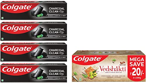 Colgate Charcoal Clean Black Gel Toothpaste Pack of 480g (120g X 4) Deep Clean Toothpaste With Bamboo Charcoal & Wintergreen Mint For Plaque Removal & Tingling Fresh Mouth ExperienceBid farewell to your usual brushing experience and say hello to an interesting one with Colgate Charcoal Clean black gel toothpaste. Refresh your senses with a toothpaste which is perfect blend of natural bamboo charcoal that helps to detoxify for a deep clean feeling & exotic Wintergreen mint with its subtle tingling and long-lasting freshness. It is a gel-based paste that is effective in removing plaque & bad breath-causing bacteria.  Not just an interesting color but also an interesting minty taste with benefits. It is an anticavity toothpaste providing freshness and whitening on regular useColgate Swarna Vedshakti Ayurvedic Cavity Protection Bad Breath Treatment Toothpaste - 400gmA Clean Mouth means a Healthy You. Your mouth is a host to germs. These germs can enter your body and increase risk of serious diseases such as Diabetes Heart Attack Respiratory Problems Gastrointestinal Diseases Alzheimer's. Colgate Swarna Vedshakti fights germs in the mouth itself and helps stop germs from entering the body. Its unique formula has been created with 5 Ayurvedic ingredients: Neem known to have gum care benefits Clove known for strengthening Amla known for its anti-ger properties Tulsi for freshness & Honey for gum massage. Colgate is India's Most Trusted oral care brand and is certified by Indian Dental Association. This toothpaste is 100% vegetarian and Gluten free. This toothpaste is made in India in our manufacturing unit that is awarded with True Zero Waste Platinum Certification.