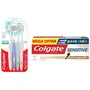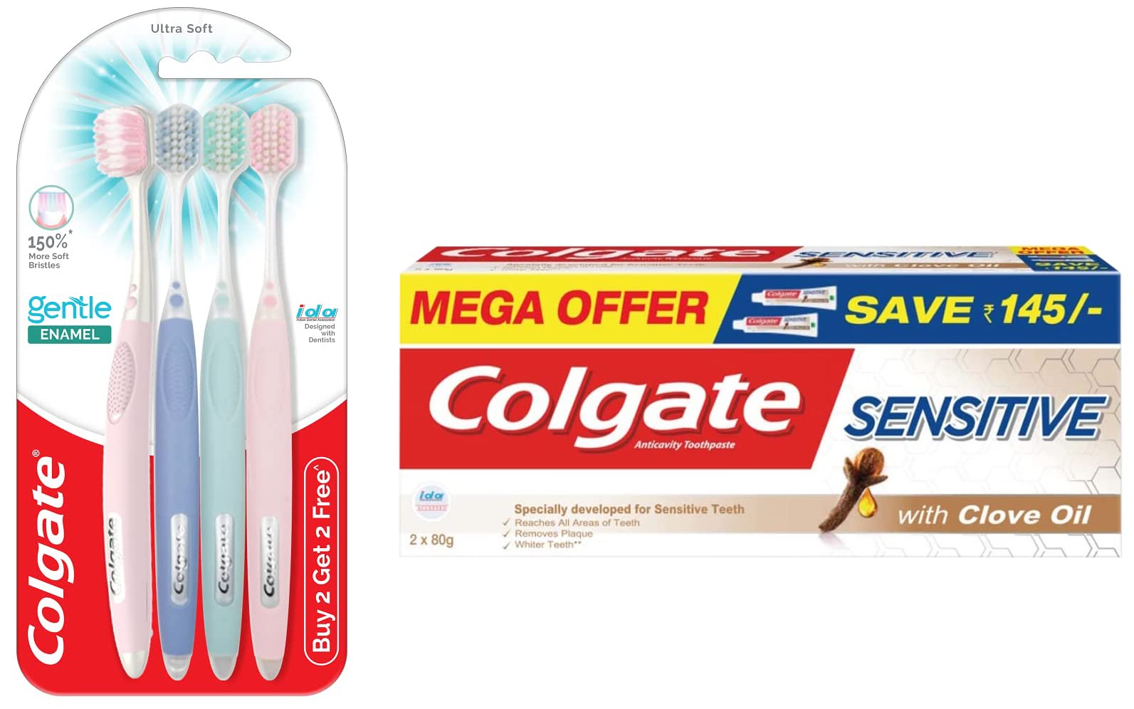 Colgate Gentle Enamel Ultra Soft Bristles Manual Toothbrush for adults 4 Pcs (Buy2 Get 2) Soft Bristles for Enamel CareMulticolorColgate introduces its new range of ultra-soft toothbrushes â Colgate Gentle. This range has been specially designed with dentists to offer the gentlest care for your teeth and is endorsed by the Indian Dental Association. Tooth enamel is the hardest substance in the human body. It protects our teeth from decay wear and acidic substances. Once your tooth enamel is damaged it cannot be replaced. Therefore using a toothbrush which is gentle on your teeth is important to protect enamel. Colgate Gentle Enamel Toothbrush is a super-soft toothbrush with 150% more soft slim tip bristles which wrap around teeth enabling complete gentle protection. Made especially for sensitive teeth Colgate Gentle Enamel Care Toothbrush comes with dual bristle technology to better fit and clean your tooth surface. The outer layer is softer for comfortable protection while the inner layer is firmer for better cleaning. The wide brush head provides greater coverage has 6X deeper reach and the flexible neck reduces pressure on your gums. Experience the gentlest and superior care with Colgate Gentle Enamel ToothbrushesColgate Sensitive Toothpaste with Clove Oil for Sensitivity Relief 160gColgate Sensitive Clove toothpaste reaches deep inside sensitive teeth areas to provide fast relief within 2 weeks & prevents sensitivity from coming back. Our toothpaste soothes and builds a protective shield around your teeth. Colgate toothpaste Sensitive contains fluoride for cavity protection & has a great tasting flavour. It builds a protective shield strengthens the enamel promotes healthy gums & builds increasing protection against sudden shocks of pain. Colgate Clove toothpaste fights plaque between your teeth and bacteria on your tongue cheeks and gums leaving your mouth with a fresh breath. It also helps prevent cavities tartar formation & sensitivity. Moisturize your brush with water. Put a pea size amount of our Colgate toothpaste on the head of the toothbrush. Insert the toothbrush into your mouth & use gentle strokes to brush your teeth. For optimal results brush twice daily for 2min. Our Colgate Sensitive Clove toothpaste is certified by the Indian Dental Association and responsibly sourced and made. It is gluten free. Children below age of 12 years should use with adult supervision