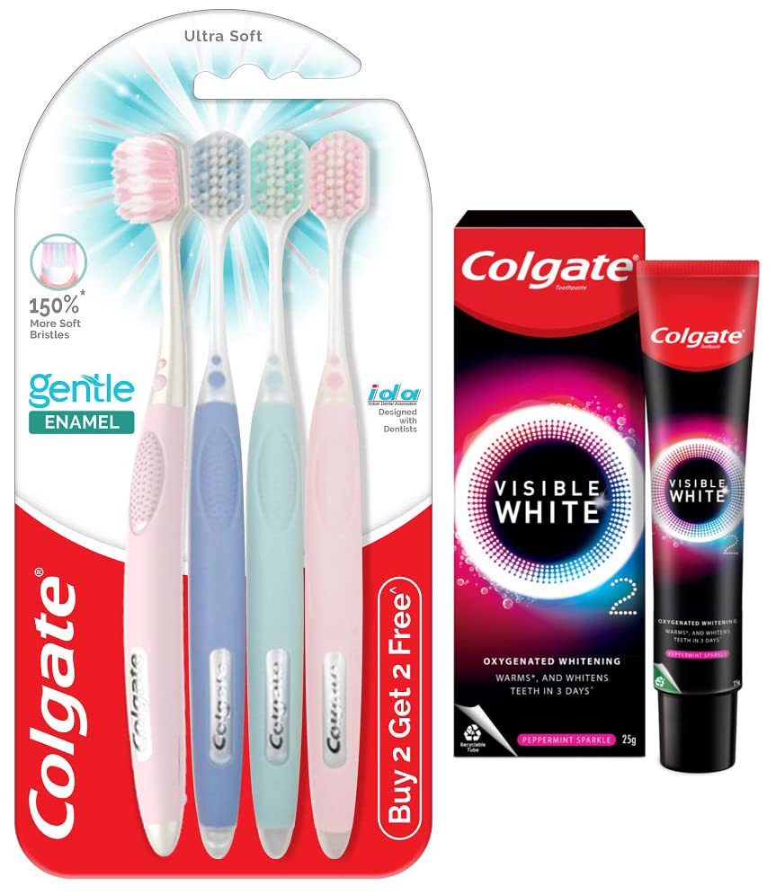 Colgate Gentle Enamel Ultra Soft Bristles Manual Toothbrush for adults 4 Pcs (Buy2 Get 2) Soft Bristles for Enamel CareMulticolorColgate introduces its new range of ultra-soft toothbrushes â Colgate Gentle. This range has been specially designed with dentists to offer the gentlest care for your teeth and is endorsed by the Indian Dental Association. Tooth enamel is the hardest substance in the human body. It protects our teeth from decay wear and acidic substances. Once your tooth enamel is damaged it cannot be replaced. Therefore using a toothbrush which is gentle on your teeth is important to protect enamel. Colgate Gentle Enamel Toothbrush is a super-soft toothbrush with 150% more soft slim tip bristles which wrap around teeth enabling complete gentle protection. Made especially for sensitive teeth Colgate Gentle Enamel Care Toothbrush comes with dual bristle technology to better fit and clean your tooth surface. The outer layer is softer for comfortable protection while the inner layer is firmer for better cleaning. The wide brush head provides greater coverage has 6X deeper reach and the flexible neck reduces pressure on your gums. Experience the gentlest and superior care with Colgate Gentle Enamel ToothbrushesColgate Visible White O2 25g Teeth Whitening Toothpaste Peppermint Sparkle Active Oxygen Technology Enamel Safe Teeth Whitening ProductWhat does it mean to smile from the inside out? Because we believe in the transformative beauty of real smiles Colgate-Palmolive is proud to introduce a revolutionary new beauty essential - Visible White O2. Formulated with a patented Active Oxygen-based tooth whitening technology it WHITENS TEETH IN 3 DAYS (when used as directed on pack). As soon as you brush Colgate Visible White O2 gives off a warming effect inside your mouth. Along with this it releases a gentle wave of ultra-fine whitening foam - that's the Active Oxygen. The millions of active oxygen bubbles get absorbed gently into your enamel and whiten teeth from the inside out! Available in 2 refreshing flavours: Aromatic Mint: Like a rushing mountain stream the freshness of this herby wintergreen mint gives a refreshing flavor that lasts. Peppermint Sparkle: Fresh bright with slight hint of spice this delightfully balanced flavor brings a long-lasting flavor that feels like your mouth is sparkling. Recommended Usage: Put a pea size amount of our Colgate toothpaste on the head of the toothbrush. Insert the toothbrush into your mouth & use gentle short strokes to brush your teeth. For a better experience try with Colgate Visible White O2 Toothbrush.