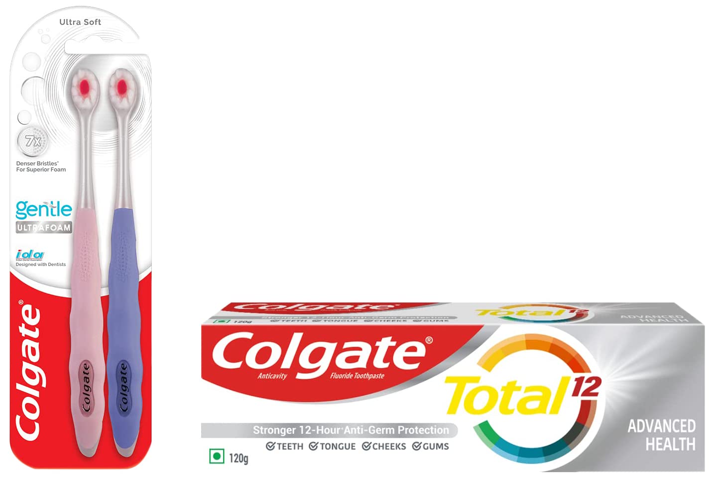 Colgate Gentle UltraFoam Ultra Soft Bristles Manual Toothbrush for adults 2 Pcs Soft Bristles for Superior Clean MulticolorBrushing your teeth when your teeth and gums are sensitive can prove to be a very unpleasant experience with a normal toothbrush. Colgate introduces the New Range of Ultra Soft Toothbrushes - Colgate Gentle. This range has been specially Designed with Dentists to offer Gentlest Care for your Teeth. It has also been endorsed by IDA. Colgate Gentle Ultrafoam is specially made for a highly sensorial brushing experience. This super-soft toothbrush is technologically enhanced to offer high-performance foaming with powerful clean. It comes with 5000 ultra-soft bristles which deliver high-performance foaming for an effective tooth & gum cleaning experience. It's super dense ultra-soft tapered bristle design promises ultimate gentlest experience with superior cleaning. Experience the gentlest yet powerful brushing experience with Colgate Gentle UltrafoamColgate Total Advanced 120g Health Cavity Protection ToothpasteOnly 20% of the germs in your mouth are on your teeth the rest 80% are on gums tongue and cheeks. Colgate Total antibacterial toothpaste fights germs on teeth tongue cheeks and gums giving you a Whole Mouth Health for 12 hours. Its dual Zinc Arginine technology actively seeks out bacteria in your mouth forming a protective barrier. Colgate Total Advanced Health toothpaste strengthens your teeth by re-mineralizing weakened enamel. It fights plaque to keep your gums healthy and repairs early teeth & gum damage all to give you a healthier & whiter smile. Colgate toothpaste not only does it fight plaque between your teeth and in all those hard to reach spaces but also fights bacteria on your tongue cheeks and gums leaving your mouth with a fresh breath. Moisturise your brush with water. Recommended Usage: Put a pea size amount of our Colgate toothpaste on the head of the toothbrush. Insert the toothbrush into your mouth & use gentle short strokes to brush your teeth. For a better experience try with Colgate Gentle UltraFoam Toothbrush. For optimal results brush twice daily for 2min.