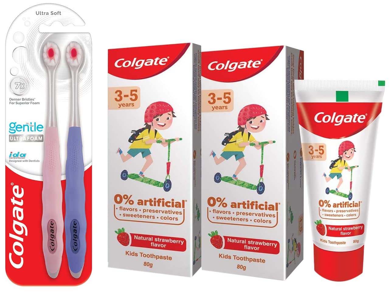 Colgate Kids Anticavity Toothpaste for 3-5 Years 160g (80g x 2) Natural Strawberry Flavour 0% Artificial SubstancesKids must brush their teeth at least 2 times a day- once in the morning and in the night. Colgate kids toothpaste comes with 0 percent artificial flavours preservatives sweetness and color so you don't have to worry about exposing your kid to artificial ingredients. It contains age appropriate fluoride level (supervise to minimize swallowing). This delicious natural strawberry flavoured premium toothpaste especially designed for kids of 3-5 years turns brushing battles into a breeze. Mom's often find it difficult to get their little ones to brush their teeth every day therefore Colgate Natural toothpaste for kids offers a fun way to ensure they enjoy good oral care habits early on! It protects against cavities and strengthens soft enamel of little teeth helping them scoot their way to healthy smiles. Developed with the help and expertise of Pediatric dentists the kids toothpaste lends a healthy and thorough clean. It ensures you and your kid are on track to building great brushing habits together without any hassle. Usage Instructions: Brush twice a day under parental supervision. Use a pea sized amount for supervised brushing to minimize swallowing. Ensure children spit out after brushing. In case of intake of fluoride from other sources consult a dentist or a doctor. Expiry- 24 months from manufacturing.Colgate Gentle UltraFoam Ultra Soft Bristles Manual Toothbrush for adults 2 Pcs Soft Bristles for Superior Clean MulticolorBrushing your teeth when your teeth and gums are sensitive can prove to be a very unpleasant experience with a normal toothbrush. Colgate introduces the New Range of Ultra Soft Toothbrushes - Colgate Gentle. This range has been specially Designed with Dentists to offer Gentlest Care for your Teeth. It has also been endorsed by IDA. Colgate Gentle Ultrafoam is specially made for a highly sensorial brushing experience. This super-soft toothbrush is technologically enhanced to offer high-performance foaming with powerful clean. It comes with 5000 ultra-soft bristles which deliver high-performance foaming for an effective tooth & gum cleaning experience. It's super dense ultra-soft tapered bristle design promises ultimate gentlest experience with superior cleaning. Experience the gentlest yet powerful brushing experience with Colgate Gentle Ultrafoam