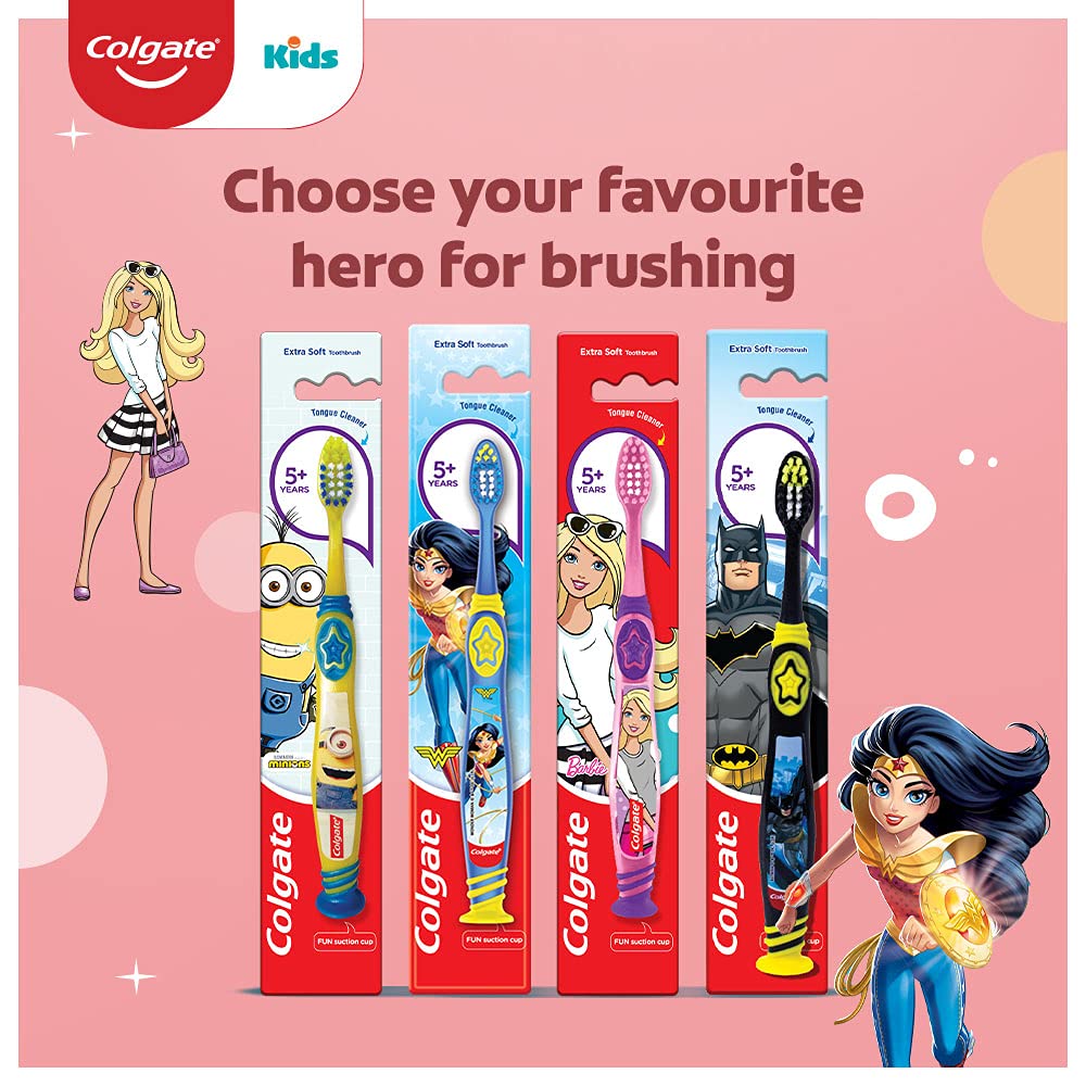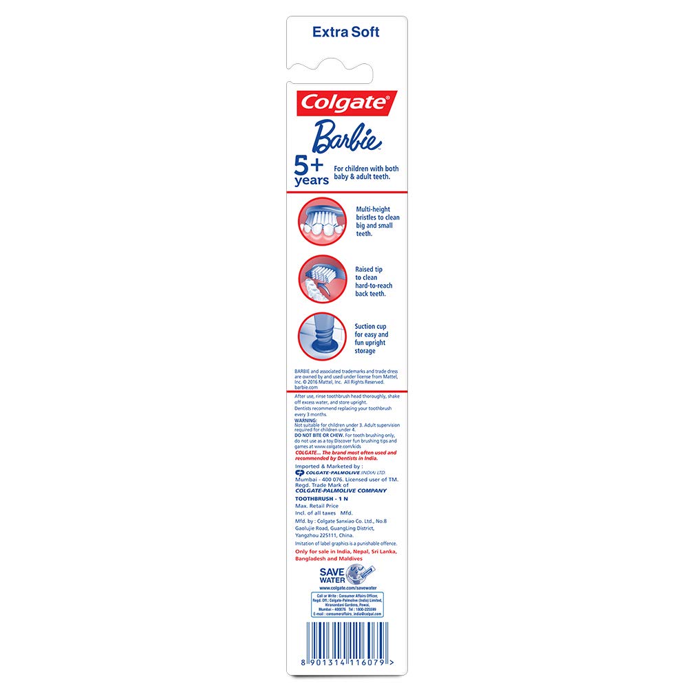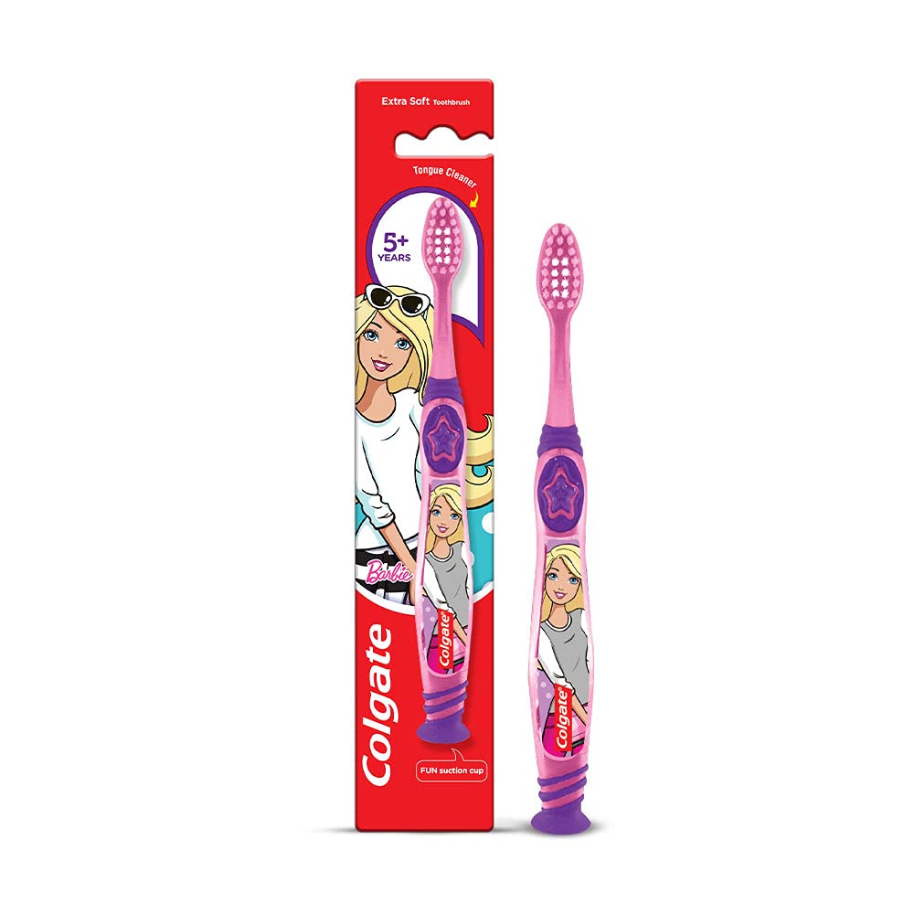 Ensure your child's dental health with the Colgate Kids Barbie Toothbrush specifically designed for kids aged 5 years and above. This toothbrush features extra soft bristles tailored for delicate gums and teeth combining functionality with fun. Its diverse bristle heights facilitate effective cleaning while the integrated tongue cleaner aids in removing bacteria. The playful non-slip handle equipped with a suction cup allows easy handling and storage. Embrace the beautiful design and superb quality that make brushing a delightful experience for your child.