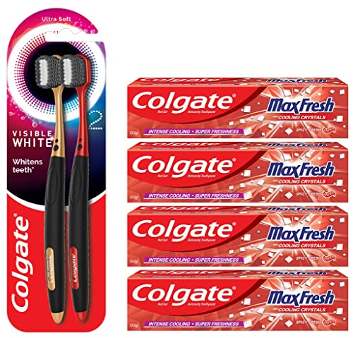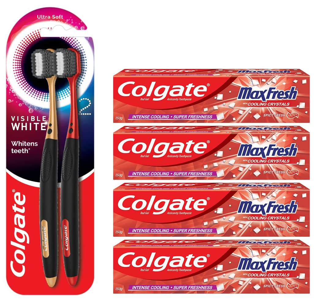 Colgate MaxFresh 600g (150g x 4 Pack of 4) Bad Breath Treatment Toothpaste Red Gel Paste With Menthol For Super Fresh Breath Spicy FreshSwitch on the power of freshness with Colgate Maxfresh toothpaste that refreshes you and helps you seize the day because every morning is a fresh start. The red gel toothpaste contains unique cooling cyrstals that give you an intense cooling while you brush. Recommended Usage: Put a pea size amount of our Colgate toothpaste on the head of the toothbrush. Insert the toothbrush into your mouth & use gentle short strokes to brush your teeth. For a better experience try with Colgate Gentle Enamel Toothbrush. For optimal results brush twice daily for 2min. Colgate is India's most trusted oral care brand. As a trusted partner we are committed to doing business with integrity and respect for all people and the world around you. Colgate offers quality oral care products including toothpastes and toothbrushesas well as expert dental health information. Colgate toothpastes are always 100% vegetarian and gluten free. We care about our environment Colgate India is the nation's first to earn True Zero Waste Platinum certification for all its four manufacturing sites in India from Green Business Certification Inc. (GBCI). This toothpaste is made in India with highest quality standards.Colgate Visible White O2 manual Toothbrush for adults - 2pcsA toothbrush that whitens teeth? Discover the Colgate Visible White O2 Toothbrush which is uniquely designed to help remove stains and whiten teeth! Experience softness like never before with the 137% more ultra-soft slimmer tip bristles made for super-gentle brushing. This soft Colgate toothbrush helps whiten your teeth by removing extrinsic stains so you can enjoy a brighter smile. Take gentle brushing and whitening to the next level with the Colgate Visible White O2 Toothbrush!