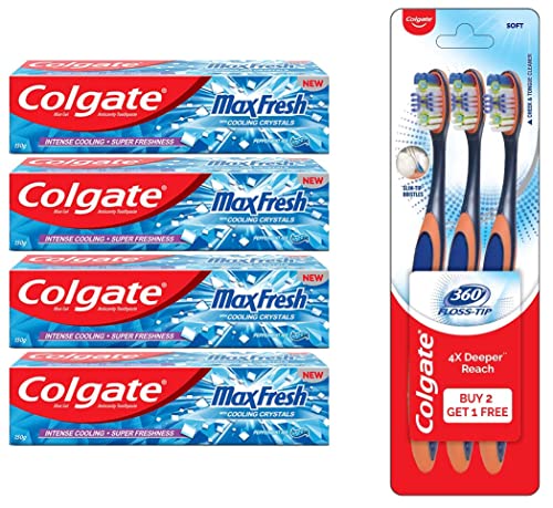 Colgate MaxFresh 600g (150g x 4 Pack of 4) Breath Freshener Toothpaste Peppermint Ice Blue Gel Paste with Menthol Cooling crystals controls Bad BreathSwitch on the power of freshness with Colgate Maxfresh toothpaste that refreshes you and helps you seize the day because every morning is a fresh start. The blue gel toothpaste contains unique cooling cyrstals that give you an intense cooling while you brush. Recommended Usage: Put a pea size amount of our Colgate toothpaste on the head of the toothbrush. Insert the toothbrush into your mouth & use gentle short strokes to brush your teeth. For a better experience try with Colgate Gentle Enamel Toothbrush. For optimal results brush twice daily for 2min. Colgate is India's most trusted oral care brand. As a trusted partner we are committed to doing business with integrity and respect for all people and the world around you. Colgate offers quality oral care products including toothpastes and toothbrushesas well as expert dental health information. Colgate toothpastes are always 100% vegetarian and gluten free. We care about our environment Colgate India is the nation's first to earn True Zero Waste Platinum certification for all its four manufacturing sites in India from Green Business Certification Inc. (GBCI). This toothpaste is made in India with highest quality standards.Colgate Toothbrush-360 Degree Flosstip for adultsManualBlackPack of 1Toothbrush