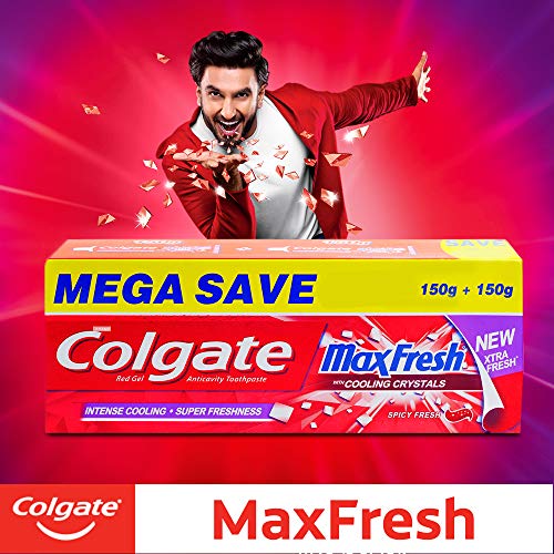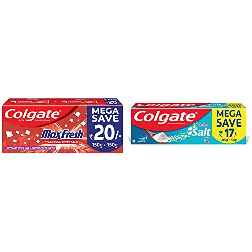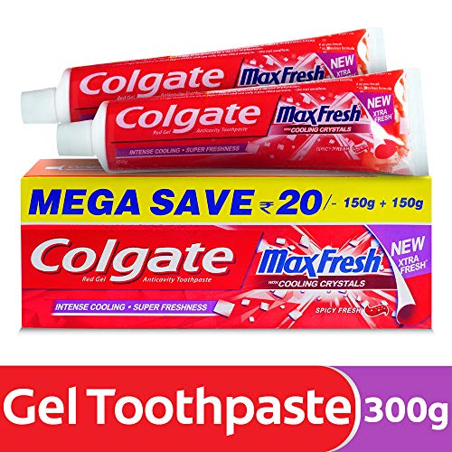 Colgate MaxFresh Anticavity Toothpaste Gel Spicy Fresh - 300gm (Saver Pack)Unleash an intense blast of lasting freshness in your mouth each time you brush with colgate maxfresh spicy fresh red gel. The unique formula with cooling crystals tingling spicy fresh flavor and the trusted protection of colgate max fresh spicy fresh red gel keep you ready for an energizing day with a sparkling white smile (as you brush) and fresher breath. With the new saver pack you can now save rs. 20 on two 150g tubese pre-packed in abo packing. Brush your teeth with colgate maxfresh spicy fresh red gel toothpaste at least twice a day to get best results or as directed by physician. Use it with a colgate toothbrush and plax mouthwash to enjoy fresh breath entire day. Order this toothpaste online and it would be delivered to your home. Colgate is the no. 1 toothpaste brandmended by dentists + oral care professional brandmendation study conducted by ipsos in may 2015.Colgate Active Salt Toothpaste 300gm (Saver Pack)Colgate active salt toothpaste is packed with the goodness of salt. It's unique formula helps fight hidden germs to give healthy gums and strong teeth. Its refreshing minty taste freshens breath. Colgate is the no. 1 toothpaste brandmended by dentists.