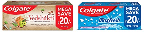 Colgate MaxFresh Toothpaste Blue Gel Paste with Menthol for Super Fresh Breath 300g 150g X 2 (Peppermint Ice Saver Pack)Switch on the power of freshness with Colgate Maxfresh toothpaste that refreshes you and helps you seize the day because every morning is a fresh start. The blue gel toothpaste contains unique cooling cyrstals that give you an intense cooling while you brush. Colgate is India's most trusted oral care brand. As a trusted partner we are committed to doing business with integrity and respect for all people and the world around you. Colgate offers quality oral care products including toothpastes and toothbrushesas well as expert dental health information. Colgate toothpastes are always 100% vegetarian and gluten free. We care about our environment Colgate India is the nation's first to earn True Zero Waste Platinum certification for all its four manufacturing sites in India from Green Business Certification Inc. (GBCI). This toothpaste is made in India with highest quality standards.Colgate Swarna Vedshakti Ayurvedic Cavity Protection Bad Breath Treatment Toothpaste - 400gmA Clean Mouth means a Healthy You. Your mouth is a host to germs. These germs can enter your body and increase risk of serious diseases such as Diabetes Heart Attack Respiratory Problems Gastrointestinal Diseases Alzheimer's. Colgate Swarna Vedshakti fights germs in the mouth itself and helps stop germs from entering the body. Its unique formula has been created with 5 Ayurvedic ingredients: Neem known to have gum care benefits Clove known for strengthening Amla known for its anti-ger properties Tulsi for freshness & Honey for gum massage. Colgate is India's Most Trusted oral care brand and is certified by Indian Dental Association. This toothpaste is 100% vegetarian and Gluten free. This toothpaste is made in India in our manufacturing unit that is awarded with True Zero Waste Platinum Certification.