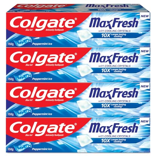 Colgate MaxFresh 600g (150g x 4, Pack of 4) Breath Freshener Toothpaste, , Peppermint Ice, Blue Gel Paste with Menthol, Cooling crystals for bad breath control