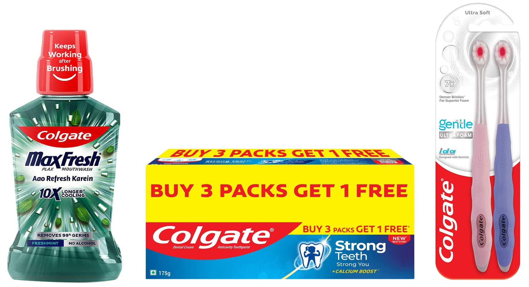 Colgate Plax Fresh Mint Mouthwash 0% Alcohol - 500 mlMouthwashColgate Gentle UltraFoam Ultra Soft Bristles Manual Toothbrush for adults 2 Pcs Soft Bristles for Superior Clean MulticolorToothbrushColgate Strong Teeth Cavity Protection Toothpaste Colgate Toothpaste with Calcium Boost 700gm Saver Pack India's No.1 ToothpasteDaant strong toh aap strong! Strong teeth chew better which leads to better absorption of nutrients making you stronger! Natural Calcium gets depleted while eating. Colgate Strong Teeth has a unique Calcium Boost formula which restores Calcium levels making your teeth 2x stronger. Colgate Strong Teeth toothpaste helps prevent cavities whitens teeth and freshens breath with regular use. This toothpaste is safe to use on kids and adults. Recommended Usage: Take pea size drop of toothpaste on a toothbrush and brush your teeth in circular motions or up and down for 2 mins twice a day. Can be used by Men women and children. Colgate is India's most trusted oral care brand. As a trusted partner we are committed to doing business with integrity and respect for all people and the world around you. Colgate offers quality oral care products including toothpastes toothbrushes and mouthwashes as well as expert dental health information. This toothpaste is 100% vegan and gluten-free. We care about our environment Colgate India is the nation's first to earn TRUE Zero Waste Platinum certification for all its four manufacturing sites in India from Green Business Certification Inc. (GBCI). This toothpaste is made in India with the highest quality standards.