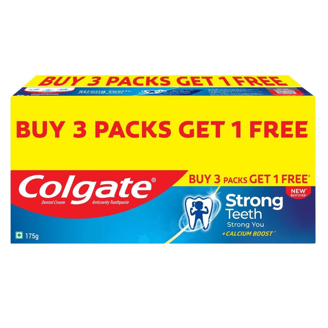 Colgate Plax Fresh Tea Mouthwash 0% Alcohol - 500 mlMouthwashColgate MaxFresh Breath Freshener Toothpaste 600g (150g x 4) Peppermint Ice Blue Gel Paste with Menthol Cooling crystals for bad breath controlColgate PalmoliveColgate Strong Teeth Cavity Protection Toothpaste Colgate Toothpaste with Calcium Boost 700gm Saver Pack India's No.1 ToothpasteDaant strong toh aap strong! Strong teeth chew better which leads to better absorption of nutrients making you stronger! Natural Calcium gets depleted while eating. Colgate Strong Teeth has a unique Calcium Boost formula which restores Calcium levels making your teeth 2x stronger. Colgate Strong Teeth toothpaste helps prevent cavities whitens teeth and freshens breath with regular use. This toothpaste is safe to use on kids and adults. Recommended Usage: Take pea size drop of toothpaste on a toothbrush and brush your teeth in circular motions or up and down for 2 mins twice a day. Can be used by Men women and children. Colgate is India's most trusted oral care brand. As a trusted partner we are committed to doing business with integrity and respect for all people and the world around you. Colgate offers quality oral care products including toothpastes toothbrushes and mouthwashes as well as expert dental health information. This toothpaste is 100% vegan and gluten-free. We care about our environment Colgate India is the nation's first to earn TRUE Zero Waste Platinum certification for all its four manufacturing sites in India from Green Business Certification Inc. (GBCI). This toothpaste is made in India with the highest quality standards.