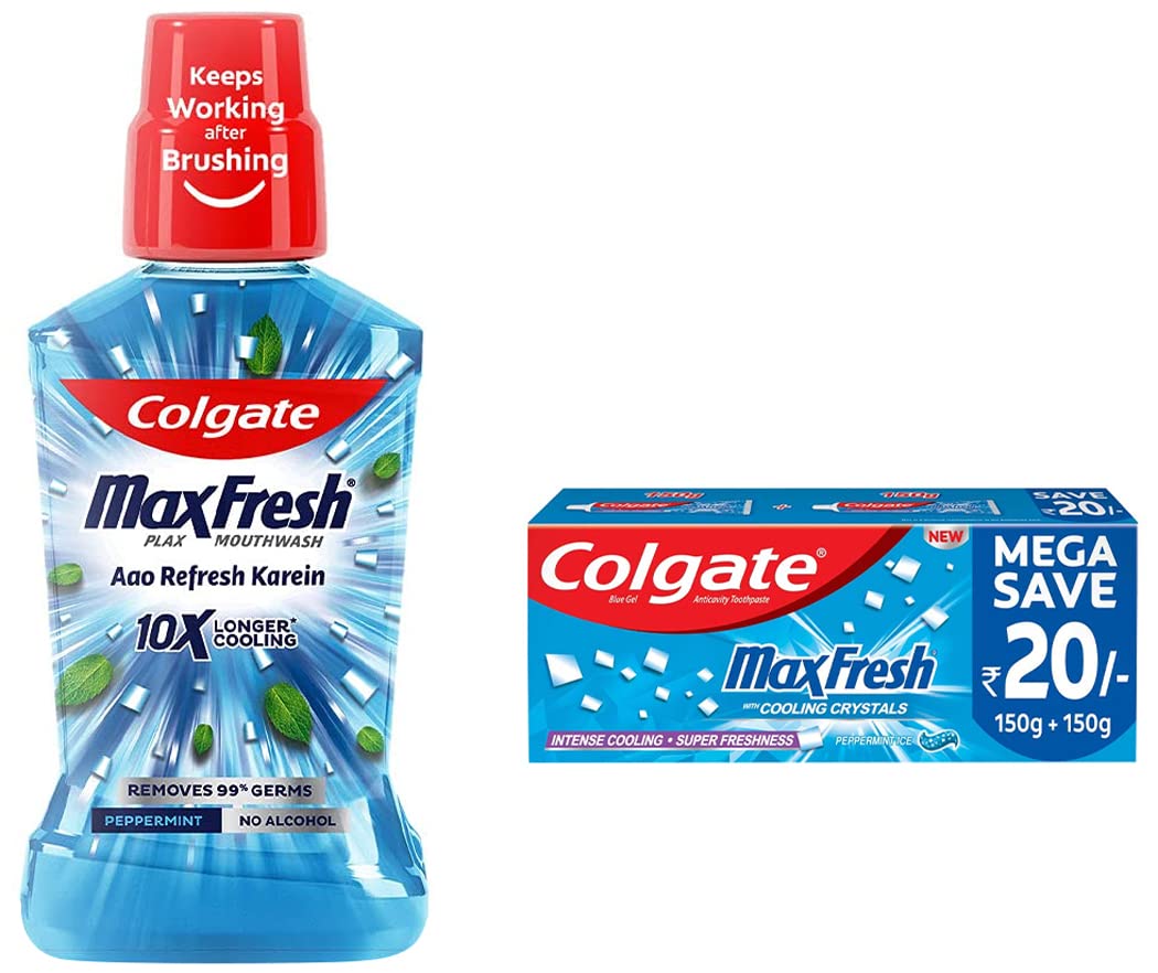 Colgate Plax Pepper Mint Mouthwash 0% Alcohol - 500 mlColgate Plax Peppermint Fresh mouthwash removes over 99% of germs that cause bad breath and cavities giving you a fresher and cleaner mouth than brushing alone. It has an extra refreshing peppermint flavour.This mouthwash contains no alcohol (non-alcoholic) hence does not cause any burning sensation when you use it. Yet it removes 99% germs instantly. You will experience an instant blast of freshness and 10X longer cooling sensation compared to brushing alone. This mouthwash gives you 24/7 control over bad breath with regular use. How to use: Fill the cap to its line (20ml). Rinse mouth with mouth wash thoroughly for 30 seconds gargle and expel. Do not swallow. This mouth wash can be used by both men and women When to use: After brushing An effective mouth freshner for your post meal needs. Colgate is India's most trusted oral care brand. As a trusted partner we are committed to doing business with integrity and respect for all people and the world around you. Colgate offers quality oral care products including toothpastes and toothbrushesas well as expert dental health information.Colgate MaxFresh Toothpaste Blue Gel Paste with Menthol for Super Fresh Breath 300g 150g X 2 (Peppermint Ice Saver Pack)Switch on the power of freshness with Colgate Maxfresh toothpaste that refreshes you and helps you seize the day because every morning is a fresh start. The blue gel toothpaste contains unique cooling cyrstals that give you an intense cooling while you brush. Colgate is India's most trusted oral care brand. As a trusted partner we are committed to doing business with integrity and respect for all people and the world around you. Colgate offers quality oral care products including toothpastes and toothbrushesas well as expert dental health information. Colgate toothpastes are always 100% vegetarian and gluten free. We care about our environment Colgate India is the nation's first to earn True Zero Waste Platinum certification for all its four manufacturing sites in India from Green Business Certification Inc. (GBCI). This toothpaste is made in India with highest quality standards.