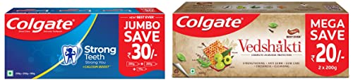 Colgate Strong Teeth Cavity Protection Toothpaste Colgate Toothpaste with Calcium Boost 500gm Saver Pack India's No.1 ToothpasteDaant strong toh aap strong! Strong teeth chew better which leads to better absorption of nutrients making you stronger! Natural Calcium gets depleted while eating. Colgate Strong Teeth has a unique Calcium Boost formula which restores Calcium levels making your teeth 2x stronger. Colgate Strong Teeth toothpaste helps prevent cavities whitens teeth and freshens breath with regular use. This toothpaste is safe to use on kids and adults. Recommended Usage: Take pea size drop of toothpaste on a toothbrush and brush your teeth in circular motions or up and down for 2 mins twice a day. Can be used by Men women and children. Colgate is India's most trusted oral care brand. As a trusted partner we are committed to doing business with integrity and respect for all people and the world around you. Colgate offers quality oral care products including toothpastes toothbrushes and mouthwashes as well as expert dental health information. This toothpaste is 100% vegan and gluten-free. We care about our environment Colgate India is the nation's first to earn TRUE Zero Waste Platinum certification for all its four manufacturing sites in India from Green Business Certification Inc. (GBCI). This toothpaste is made in India with the highest quality standards.Colgate Swarna Vedshakti Ayurvedic Cavity Protection Bad Breath Treatment Toothpaste - 400gmA Clean Mouth means a Healthy You. Your mouth is a host to germs. These germs can enter your body and increase risk of serious diseases such as Diabetes Heart Attack Respiratory Problems Gastrointestinal Diseases Alzheimer's. Colgate Swarna Vedshakti fights germs in the mouth itself and helps stop germs from entering the body. Its unique formula has been created with 5 Ayurvedic ingredients: Neem known to have gum care benefits Clove known for strengthening Amla known for its anti-ger properties Tulsi for freshness & Honey for gum massage. Colgate is India's Most Trusted oral care brand and is certified by Indian Dental Association. This toothpaste is 100% vegetarian and Gluten free. This toothpaste is made in India in our manufacturing unit that is awarded with True Zero Waste Platinum Certification.